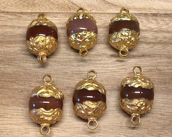 This listing is for 1 piece.At wholesale price!!!Measurement: approximately Length 35 mm ( measuring from bail to bail ), width 20 mm from the widest side, bail size: 5 mm and weighs about 13.6 gm.These beautiful high quality 18K Matt Gold Overlay over brass with anti-tarnish finish so that It will not tarnish. These Tibetan beads were handcrafted in Nepal. Hand-carved beads made with natural Carnelian Gemstone. These Beads are sure to make an impact on your jewelry project. These beads would be a great addition to your necklace or bracelet project. These beads would look great strung on beaded necklace or in Chain.Please note: you will receive a random bead.Disclaimer: Items are handmade so please note: Each item is unique may have some small imperfections. There can be a slight difference in actual color than shown in picture.Images may appear enlarged or smaller. Please refer to the measurements given. ✤ Keep in mind:1. Product VarianceAs the jewelry is handmade in nature, the items may experience variance in texture, shape, color, and finish. This also comes with some imperfections, which sets them apart from jewelry made in a factory – that being said please read the description thoroughly and view the pictures before you make your final purchase. As always, please don’t hesitate to ask us if you have any questions as we are more than happy to provide you with utmost quality assurance. 2. Photography & ColorsDue to the fact that we photograph each of our items, some items may seem larger than the actual size and the colors may seem off as well, please make sure to read the dimensions in order to avoid problems that can be easily taken care of. We do our best to photograph the items with as much detail as possible, however, images can deceive the eye, again – feel free to reach us with any questions or concerns!3. LiabilityDiscover Designs Inc. shall not be held responsible for any injuries, damages, or losses resulting from the use of products purchased from our shop. Therefore, by purchasing from our Etsy Store, you the costumer agree that all purchases and uses of products are responsibilities of the buyer. With that said, Discover Designs will not be held responsible for the use, misuse, or mishandling of any items and buyers assume all liabilities for the products they have purchased. The purchase of an item from Discover Designs demonstrates acceptance of this disclosure and releases Discover Designs and its affiliates from liabilities arising thereof. ✪Not a toy, not intended for use by, or in products intended for children 14 or under. May be harmful if swallowed.Thanks for stopping by!