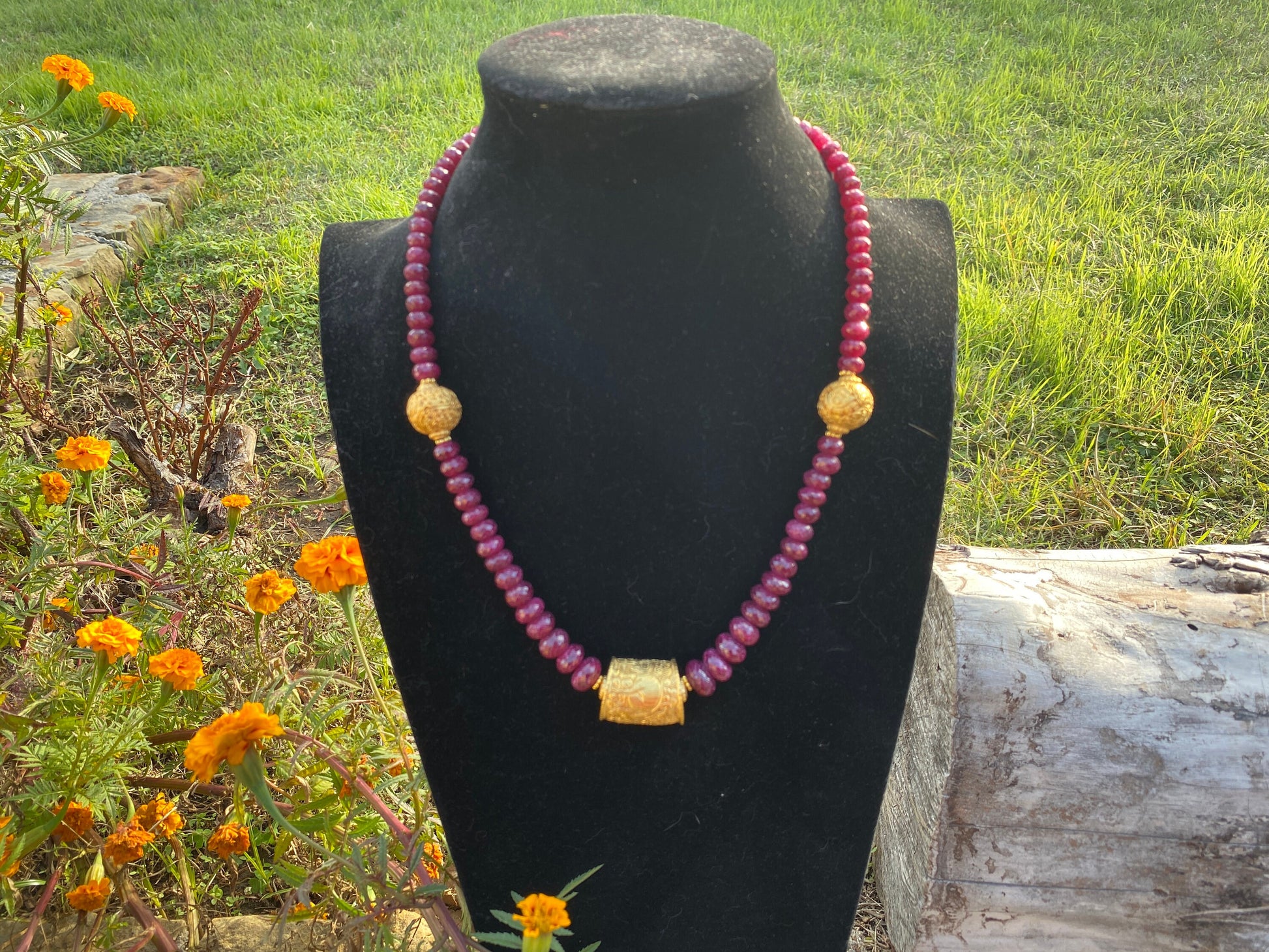 Premium Ruby Precious Gemstone Necklace with Himalayan Handcrafted 18K Brushed Gold Overlay Over Brass Focal Beads. The necklace connects with S-HookMeasurement: approximately Length 22 inches (measuring from Hook to bottom), Graduated 7mm- 14mm Ruby Beads, and weight about 130.80 gm