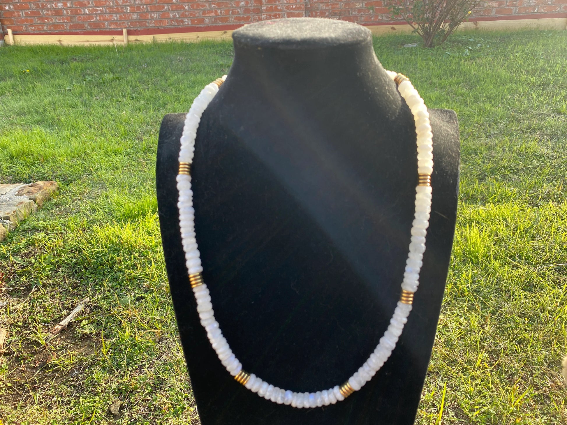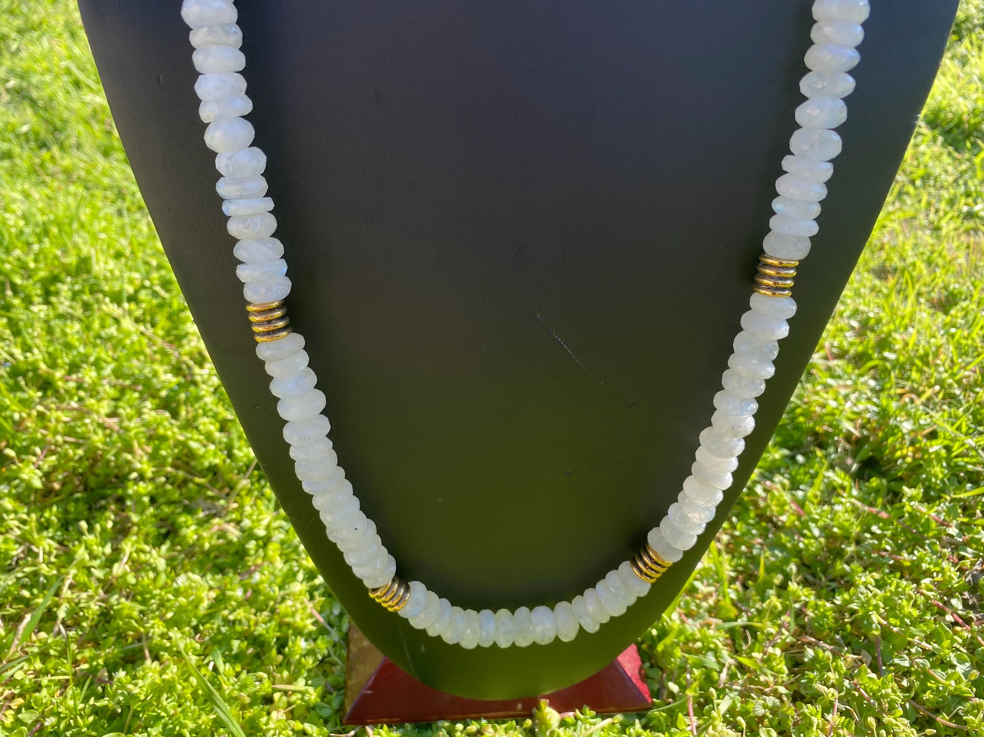 28" Long 10mm Faceted Rainbow Moonstone Beads Necklace, 18K Brushed Gold Overlay Focal Beads Necklace, Rondel White Gemstone Women necklace