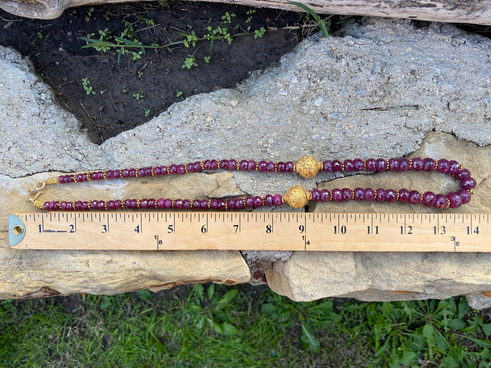 Premium Ruby Precious Gemstone Necklace with Himalayan Handcrafted 18K Brushed Gold Overlay Over Brass Focal Beads. The necklace connects with S-HookMeasurement: approximately Length 28 Inches (measuring from Hook to bottom), Graduated 5mm- 12mm Ruby Beads, and weight about 151.20 gm