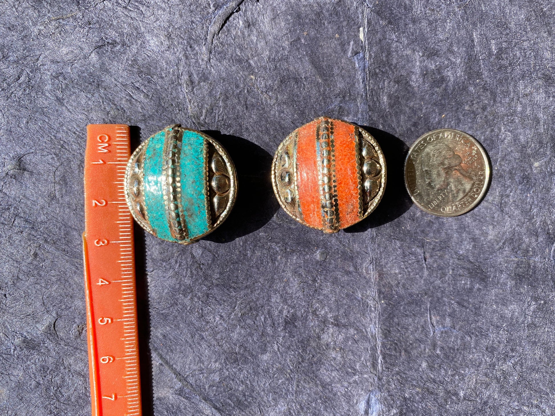 30 mm Tibetan Silver Center Beads, Turquoise or Coral Inlaid, Himalayan Bead for Necklace, Bracelet Charm, Mala Bead, Hill Tribe Center Bead