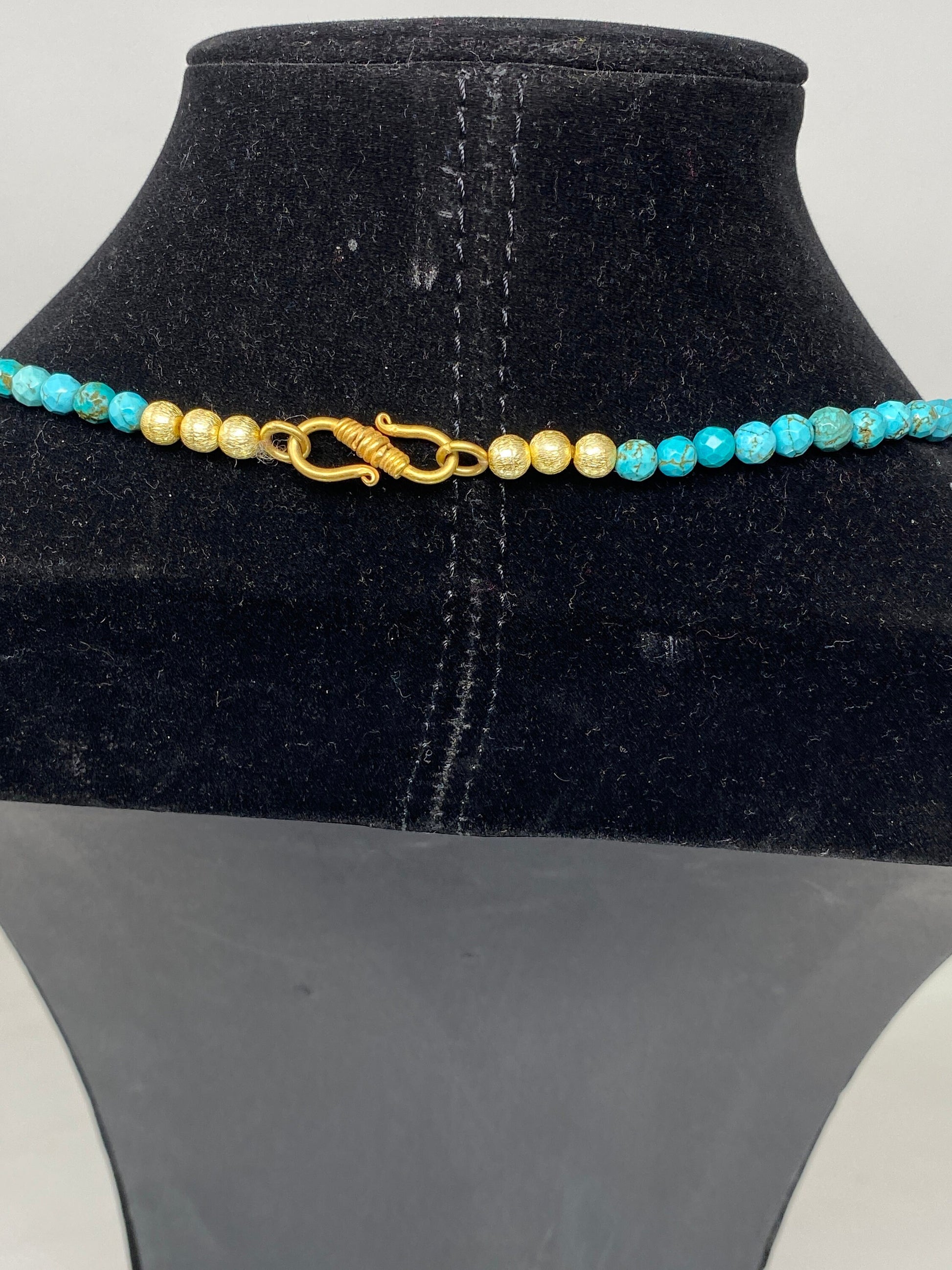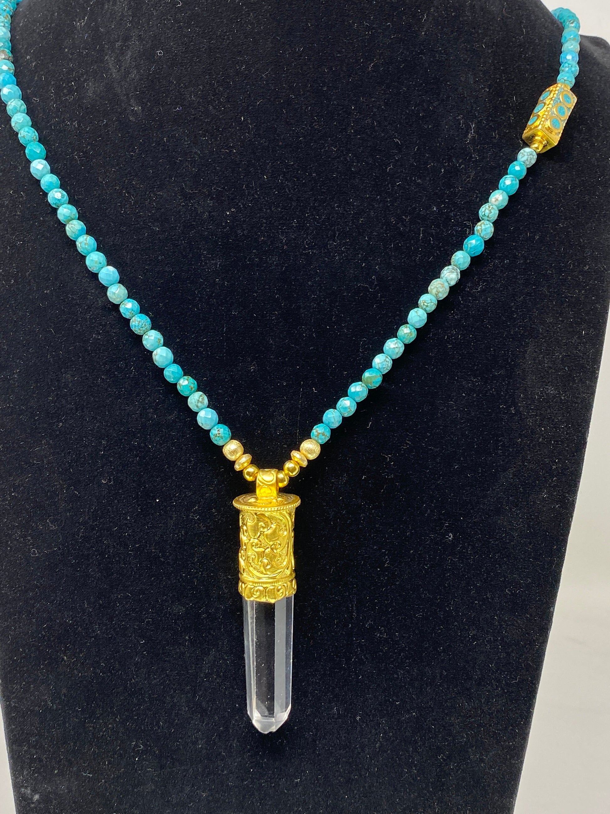 36" Long Turquoise Necklace, 6mm Faceted Round Shape Himalayan Pointed Crystal Pendant Turquoise inlaid on Focal Bead 18k Matte Gold Overlay