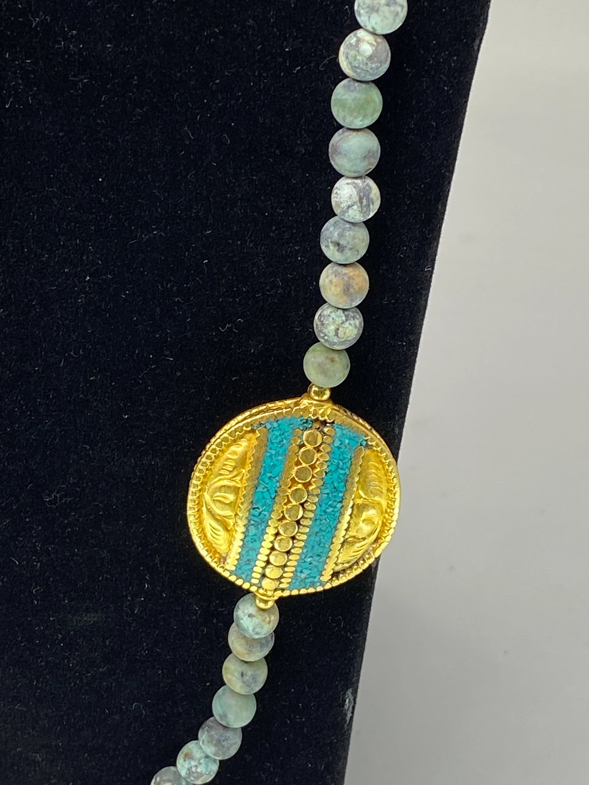 This listing is for 1 piece.At wholesale price!!!This is a truly majestic piece of jewelry statement long necklace. It is a beautiful and unique accessorize which will make a stunning addition to your costume. This is 100% handmade necklace with beautiful natural African Turquoise gemstone necklace with Turquoise and Coral Inlaid on focal Nepal bead made with 18k Matte Gold overlay over brass with anti tarnish finish. The necklace looks more beautiful in real life. If you need any more information please do not hesitate to contact me.Measurement: approximately Length 38 inches, focal bead 27 mm Round Shape & 18 mm Triangle Shape, Necklace weight about 84 gm.