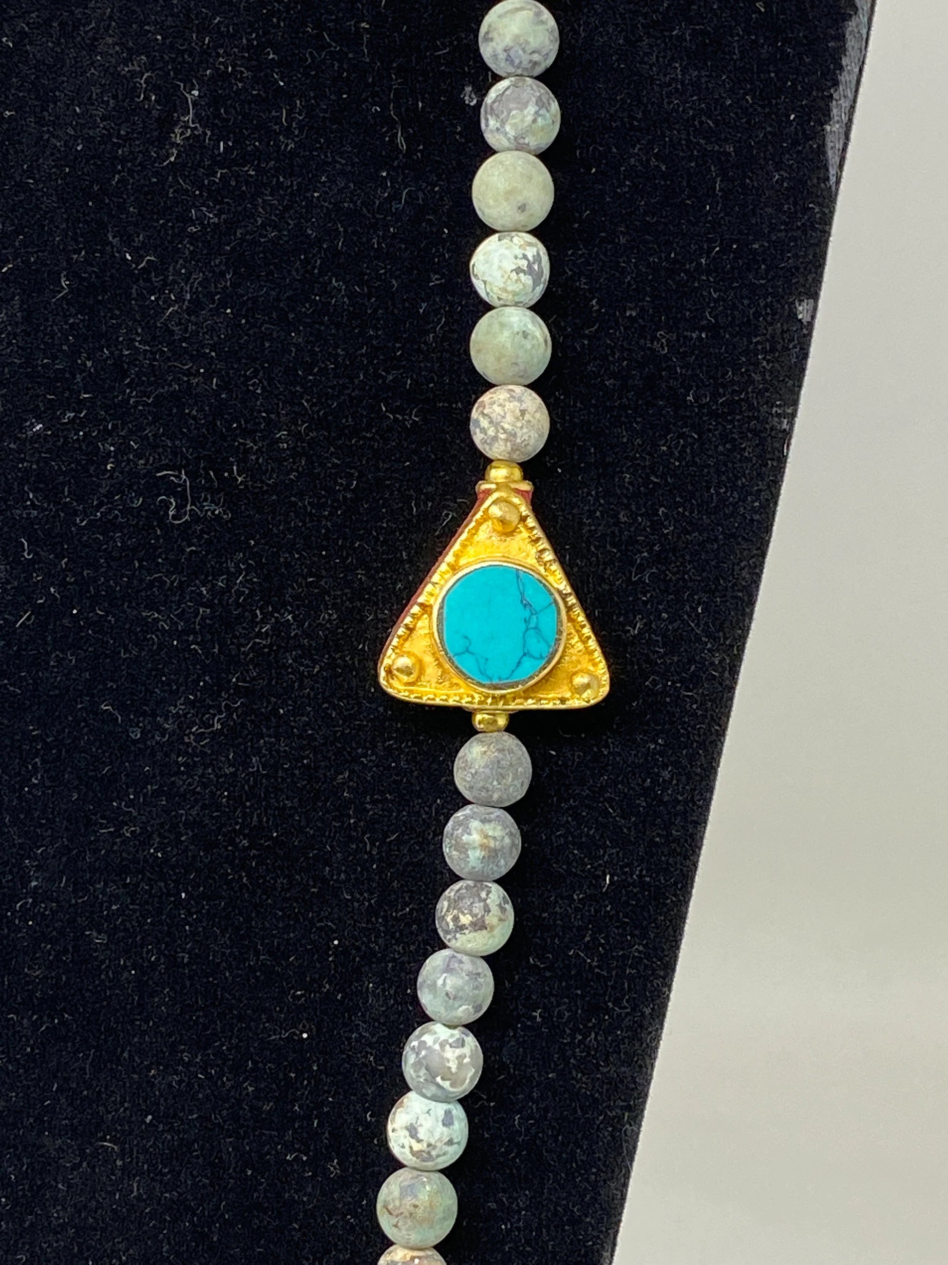 38" Long African Turquoise Necklace, 7 mm Round Shape, 18k Matte Gold Overlay Focal Beads, Turquoise & Coral Inlaid, Natural Gemstone Beaded