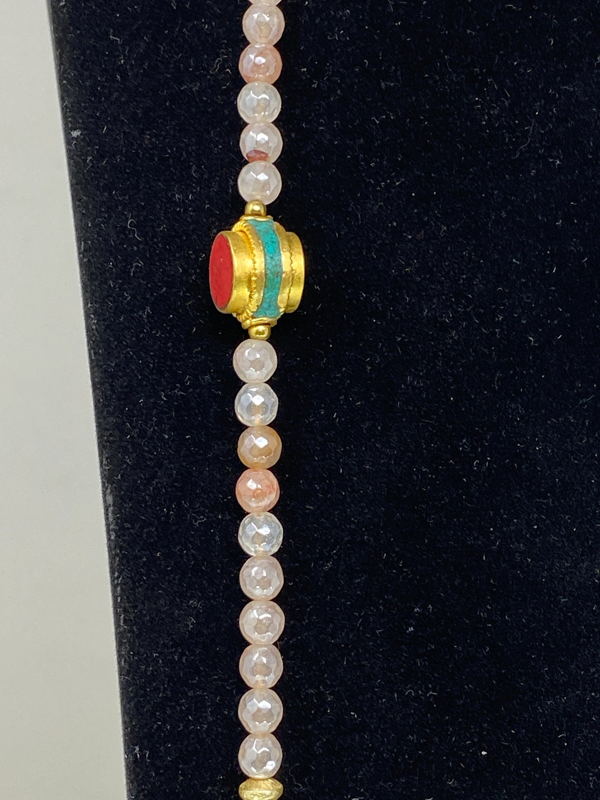 40" Long 6mm Faceted Rose Quartz Necklace, Coral & Turquoise Inlaid on Focal Bead. 18K Matte Gold Overlay, Tibetan Beaded Necklace