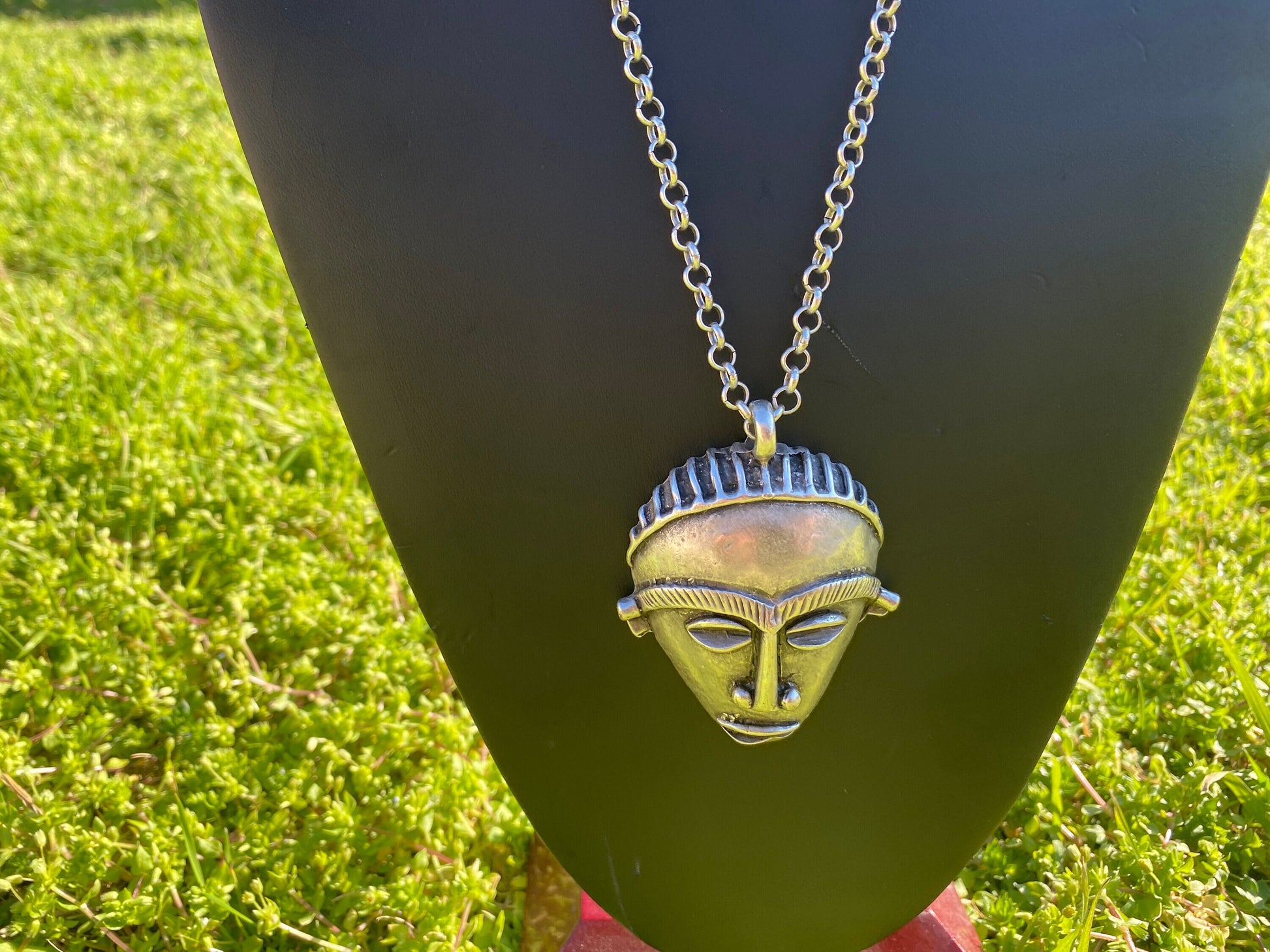 Adjustable 32" Long 5 mm Rollo Chain Necklace with Antique Silver Tone African Tribal Mask Pendant, Ethnic Jewelry, African Jewelry