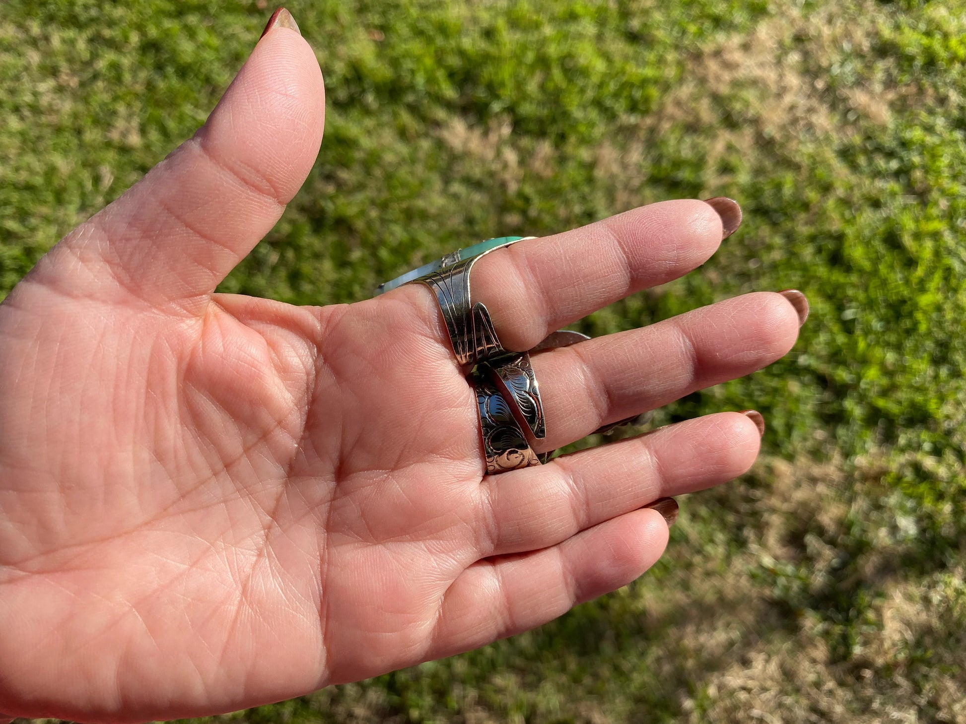 Large adjustable ring is absolutely stunning. It is a great statement piece. Beautiful adjustable band. You will receive the exact ring shown in the pictures. This statement piece ring is handmade in Nepal. Beauty of this ring that is unmatched as they are handmade and are one of a kind. With the nature of them being handmade, each product is unique in its own right and no two products are the exact same. Made with Tibetan Silver & Chalcedony Natural Stone