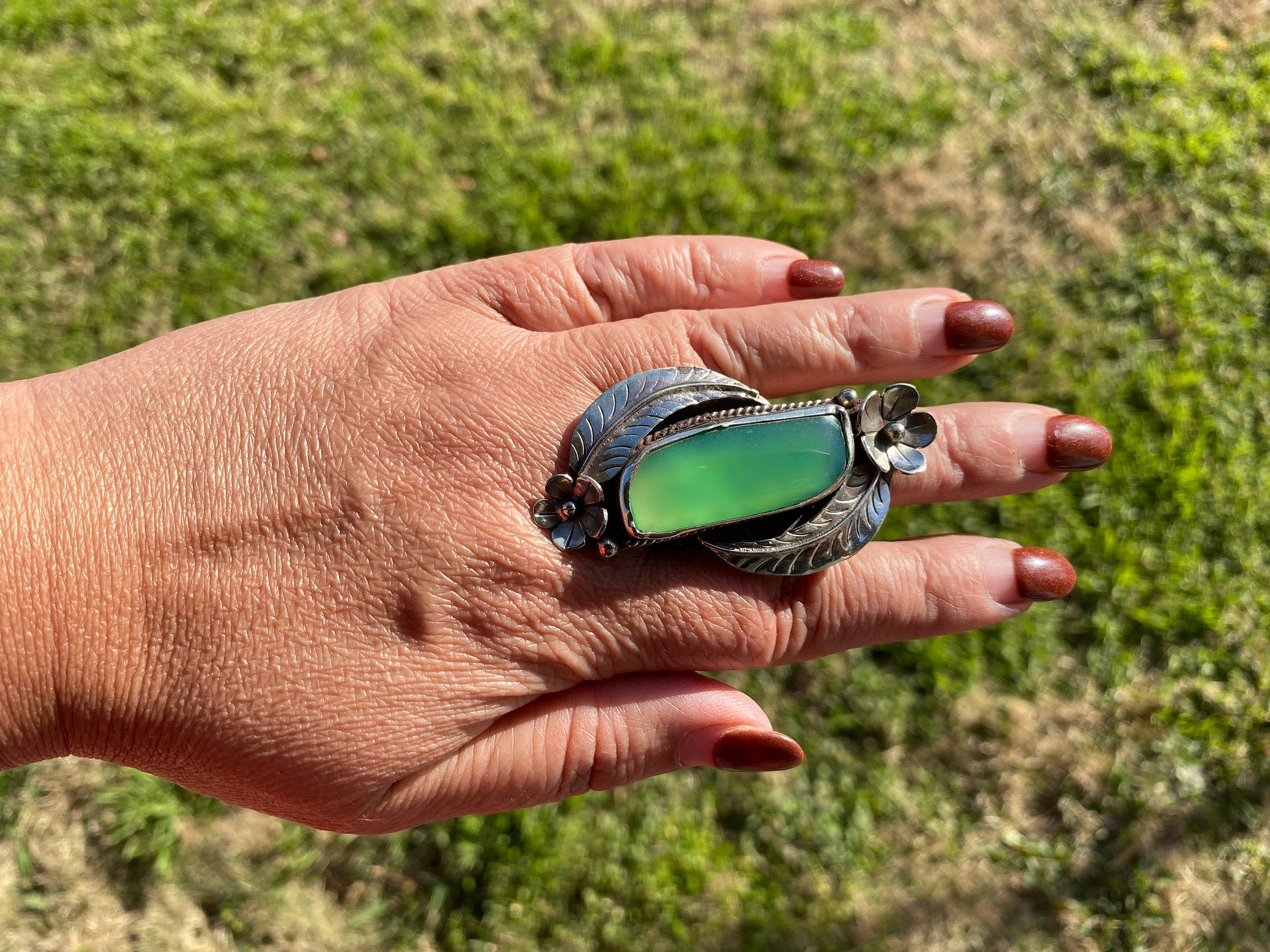 Large adjustable ring is absolutely stunning. It is a great statement piece. Beautiful adjustable band. You will receive the exact ring shown in the pictures. This statement piece ring is handmade in Nepal. Beauty of this ring that is unmatched as they are handmade and are one of a kind. With the nature of them being handmade, each product is unique in its own right and no two products are the exact same. Made with Tibetan Silver & Chalcedony Natural Stone