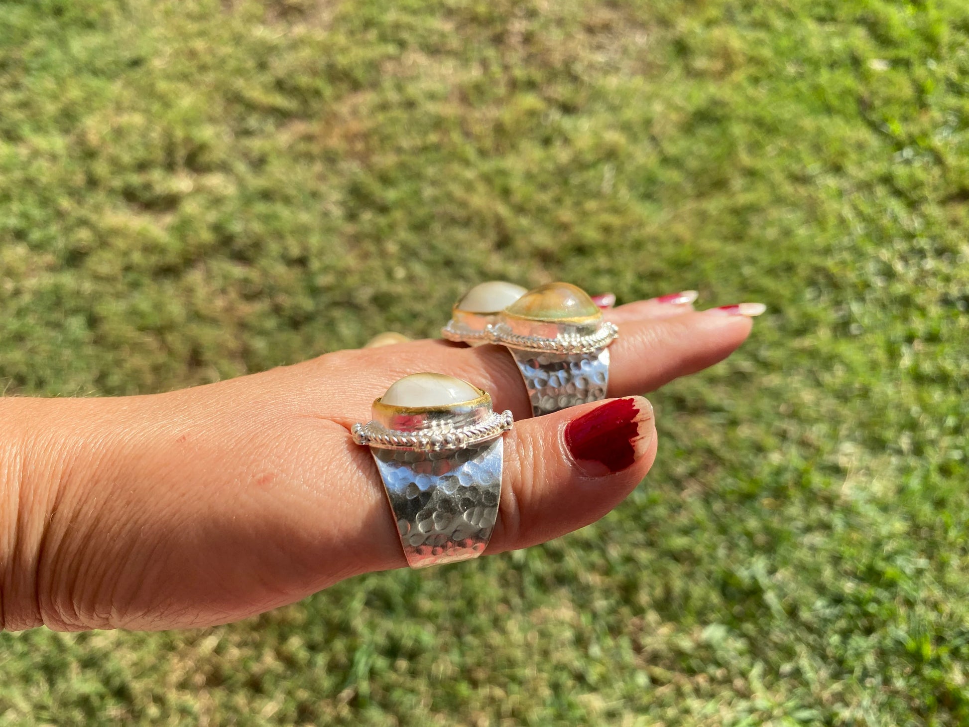 Adjustable Crunch Shell Two Tone Ring, Brushed Gold and Silver Overlay, Wide Band, Hippie Ring, Hammered Ring, Marine Inspired Ring