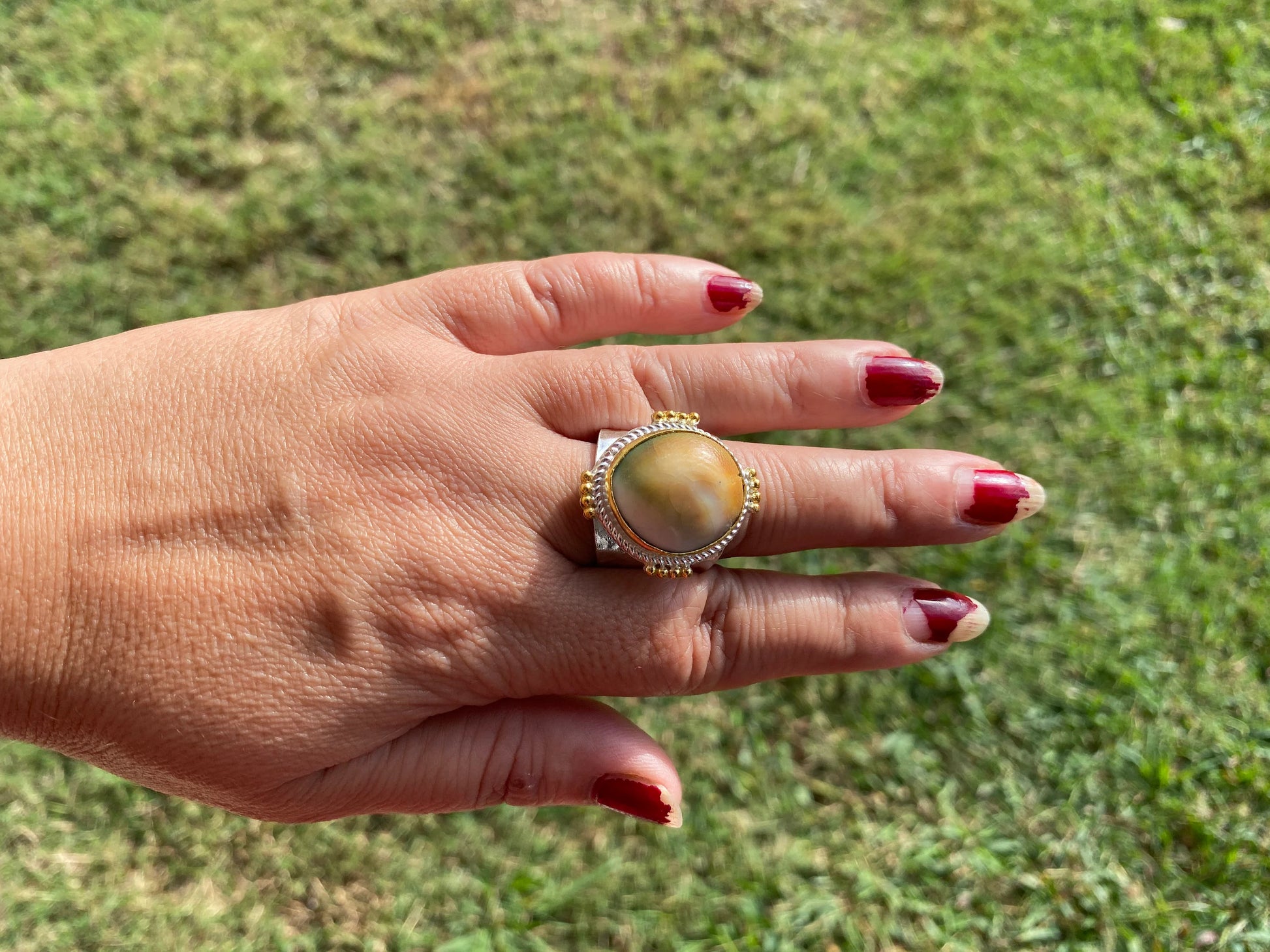 Adjustable Wide Band Ring made with Crunch Shell Gold & Silver Overlay Ring. You will receive the exact ring shown in the pictures. This high quality durable statement piece ring is handmade in Nepal. Beauty of this ring that is unmatched as they are handmade and are one of a kind. With the nature of them being handmade, each product is unique in its own right and no two products are the exact same.