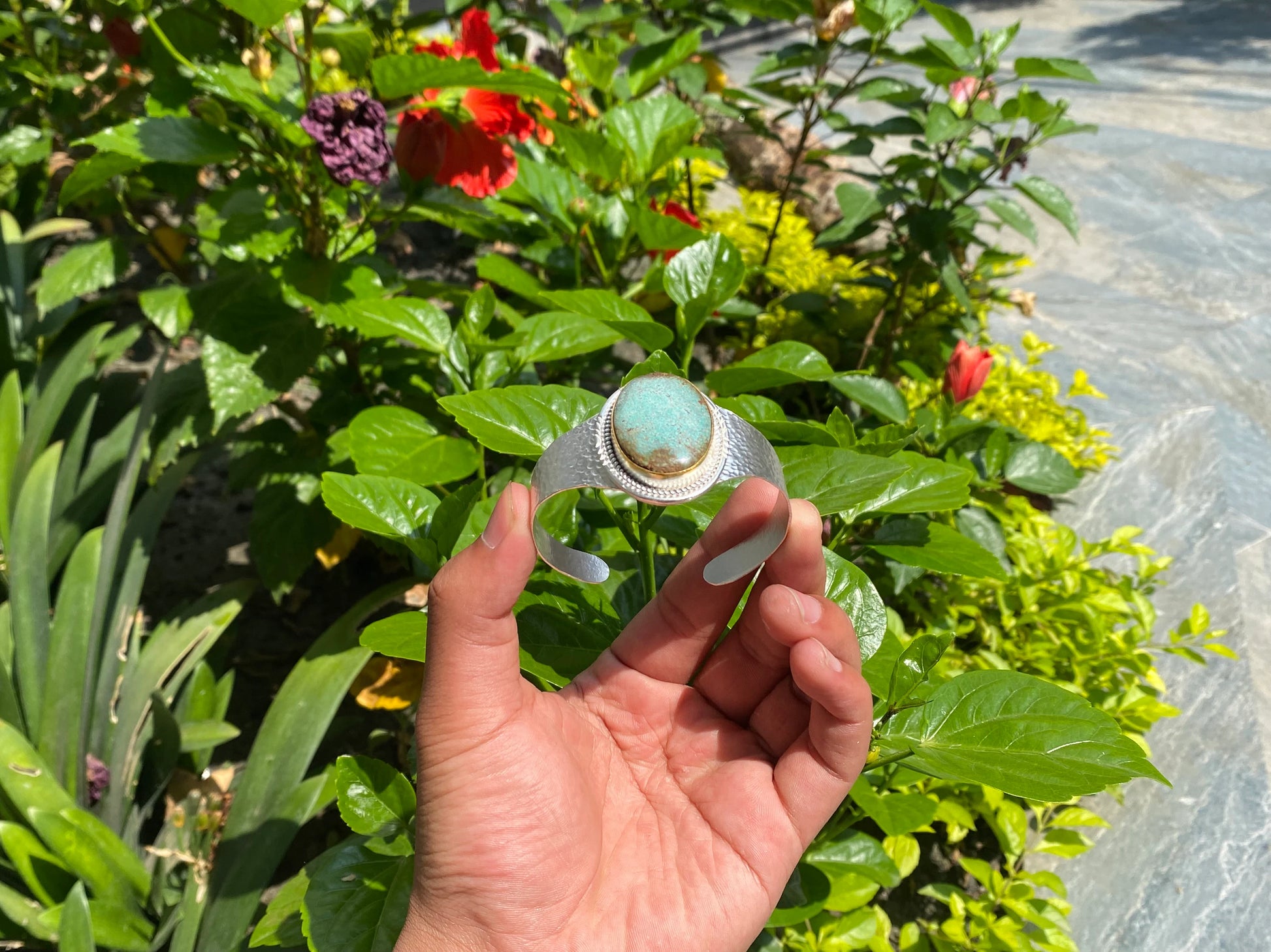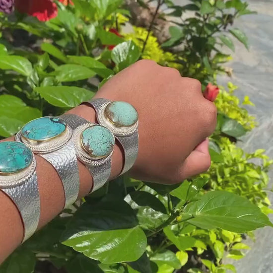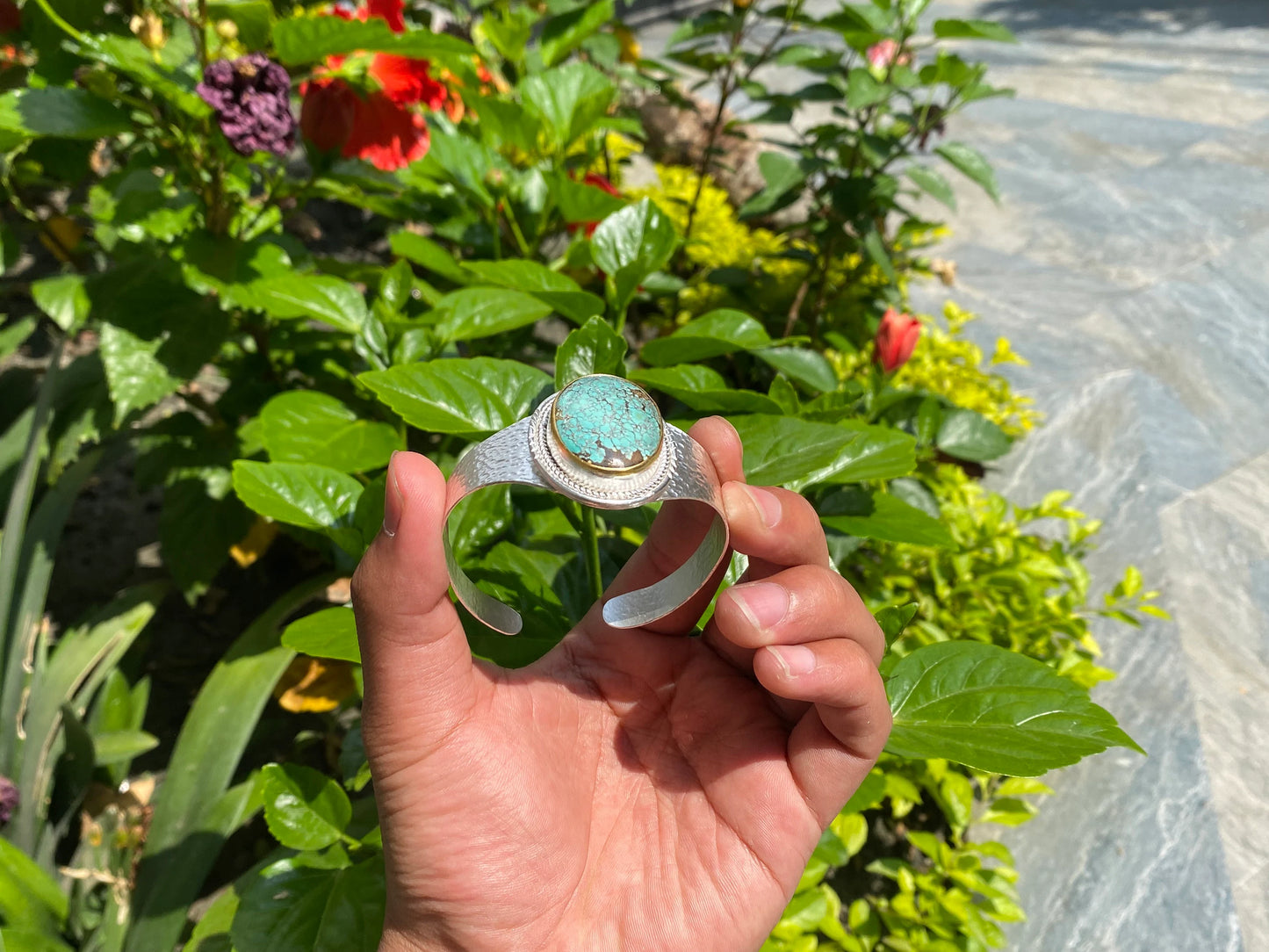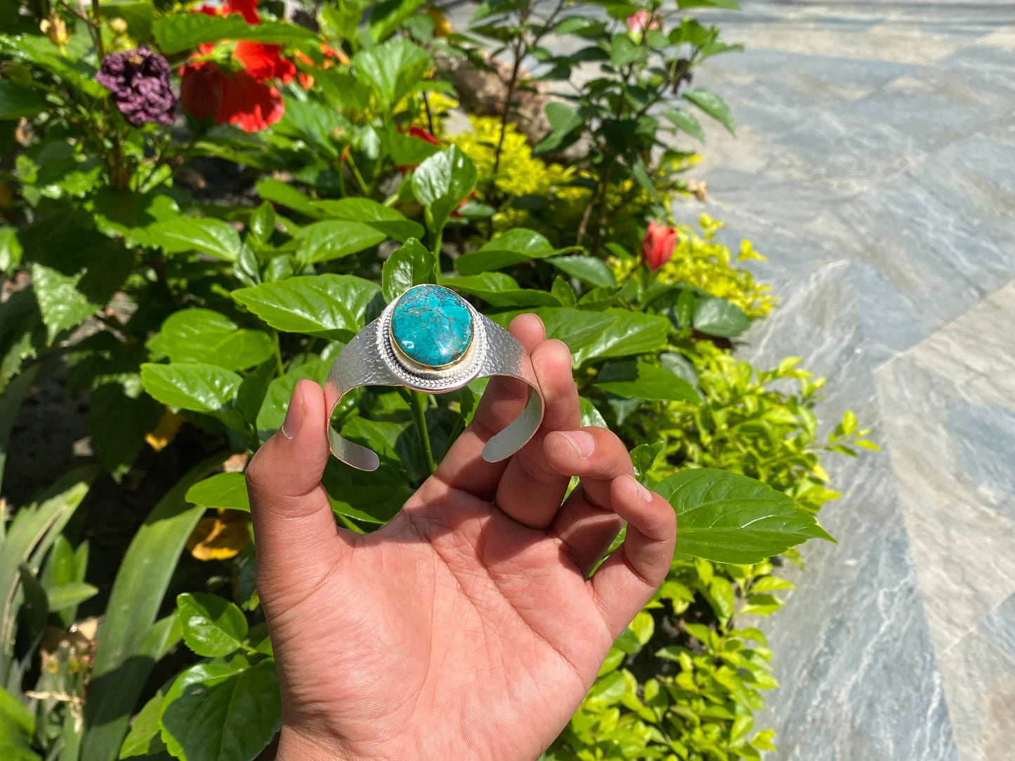 This adjustable unisex bracelet is created in Nepal with natural turquoise gemstones. It has a distinctive two-tone design with silver and gold overlays, making it a versatile accessory. The superb craftsmanship and natural beauty of turquoise make it an ideal present for any occasion, combining traditional artistry with modern flair.