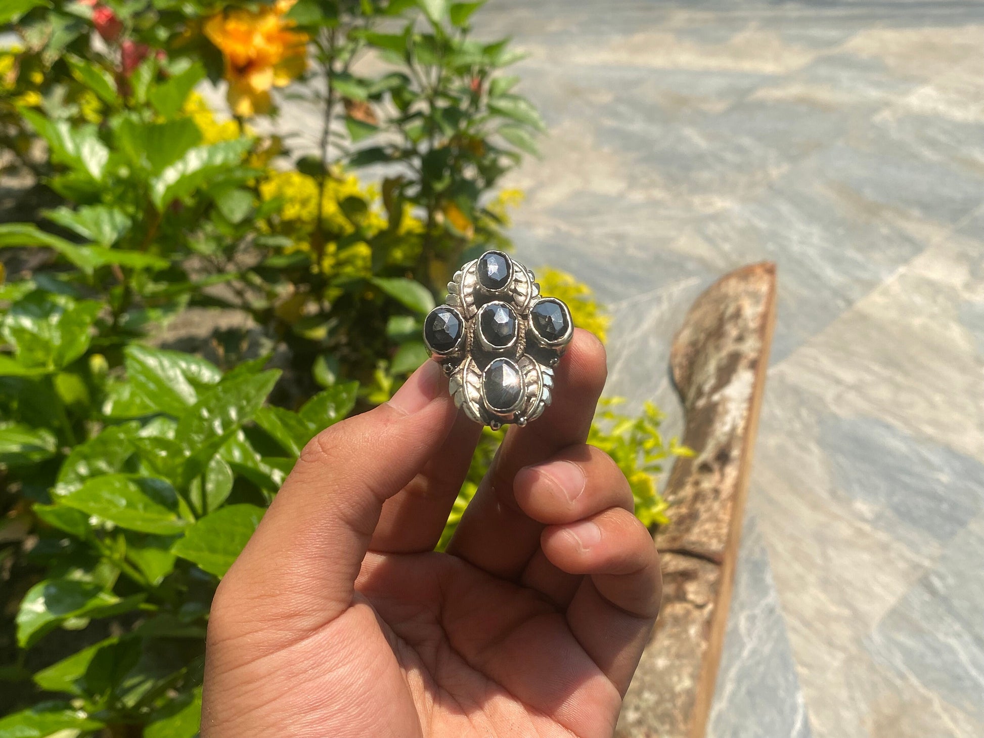 With a beautiful Black Onex gemstone set in a bold hammered design, this adjustable Tibetan Silver Ring displays exquisite craftsmanship. Its distinctive flower design lends an exquisite touch that is evocative of priceless antiques. It is a handcrafted piece of modern versatility that embodies traditional creativity, made in Nepal. Ideal for people who value both modern design and traditional history.