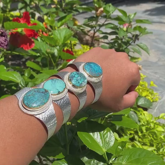 Natural turquoise gemstones are used in this adjustable unisex bracelet, which was handmade in Nepal. It has a distinct two-tone design with silver and gold overlays, making it a versatile accessory. The superb craftsmanship and natural beauty of the turquoise make it an ideal present for any occasion, combining traditional artistry with contemporary elegance.