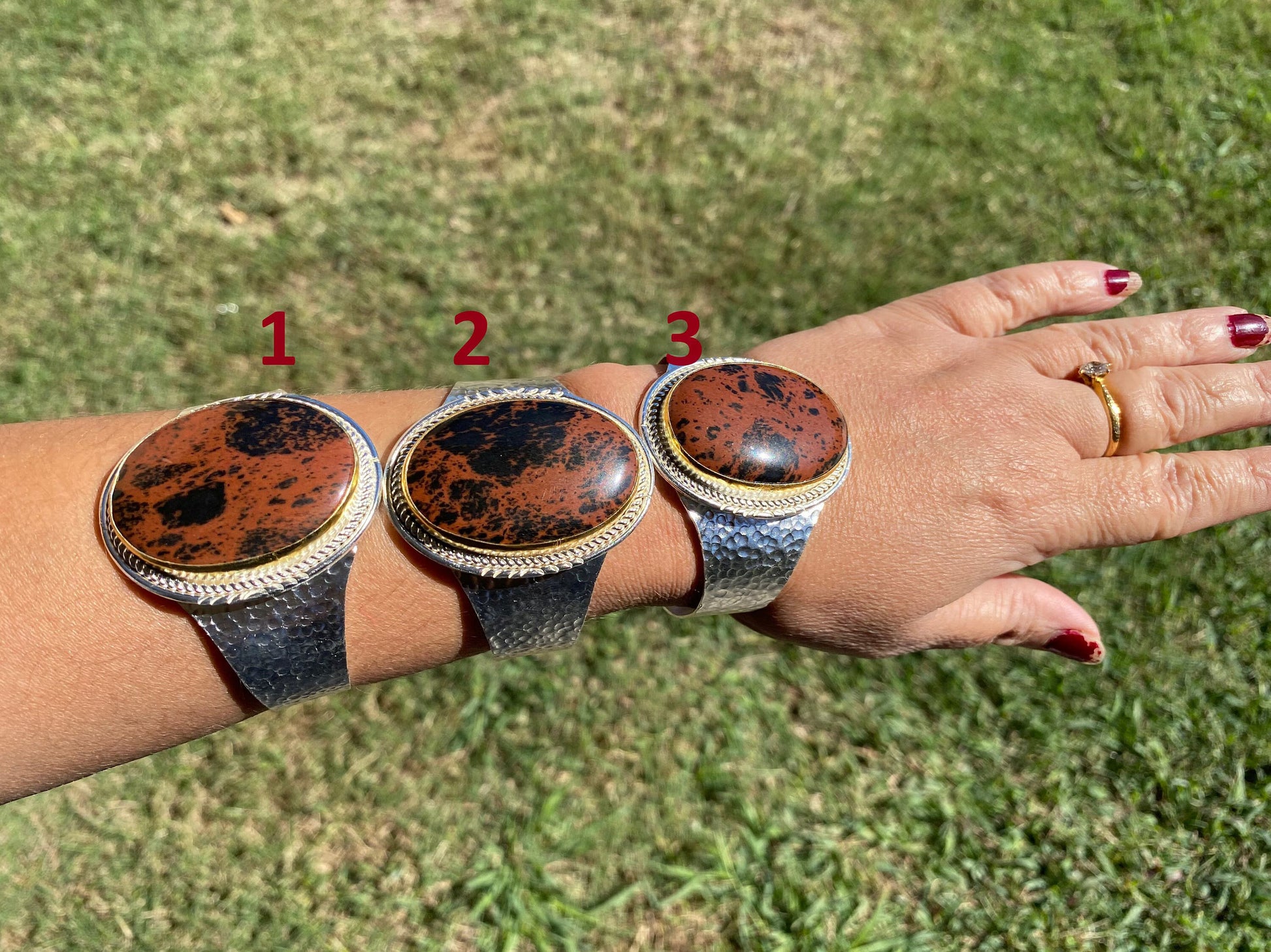 Adjustable Two Tone Cuff Bracelet, Jasper Natural Stone, Brushed Gold with Silver Overlay, Hammered Bracelet, Wide Cuff, Handcrafted Jewelry