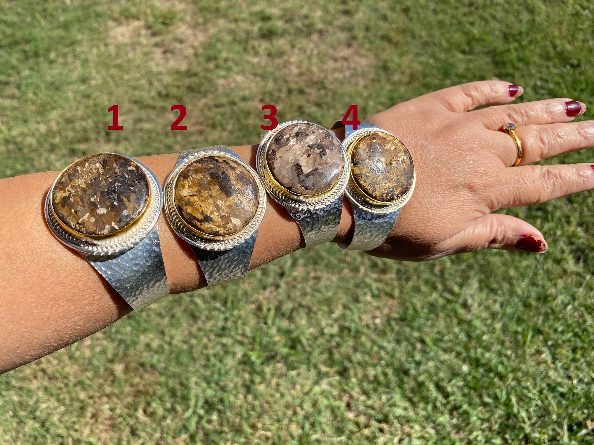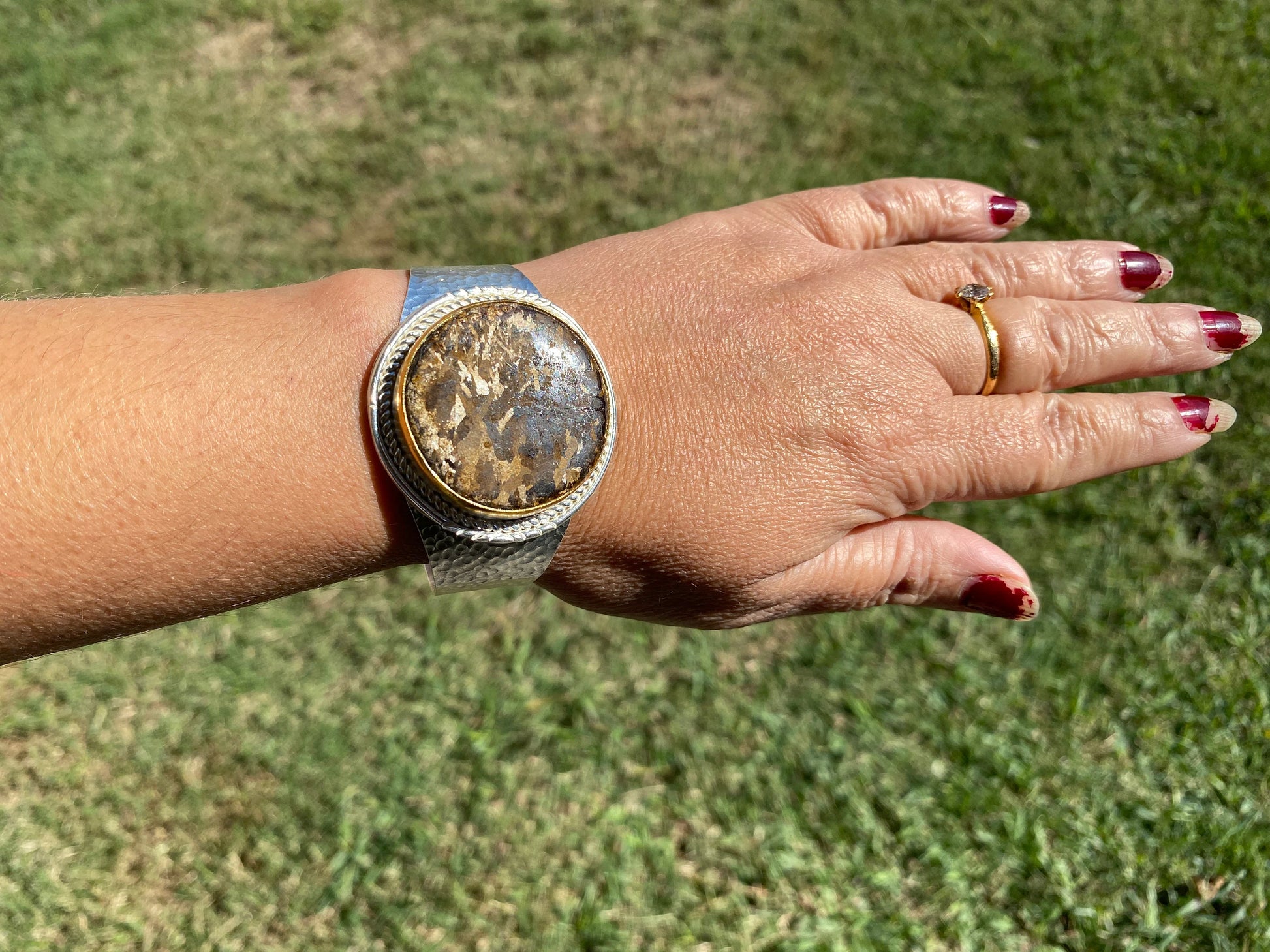 Adjustable Two Tone Cuff Bracelet, Jasper Natural Stone, Brushed Gold with Silver Overlay, Hammered Bracelet, Wide Cuff, Handcrafted Jewelry