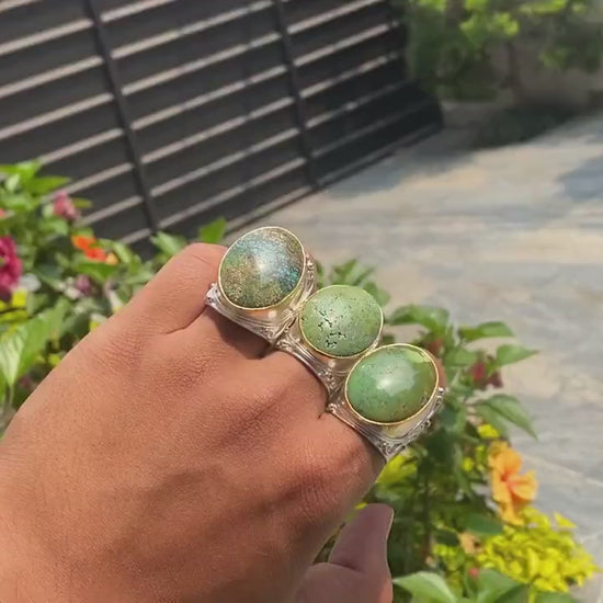 This flexible Handmade turquoise ring made in Nepal, exudes boho charm while perfectly blending rustic charm and sophisticated elegance. The two-tone gold and silver overlay is designed to be versatile and emanates artistic flare. Its unisex design appeals to free-spirited individuals looking for a striking piece. This handcrafted masterpiece, whether worn alone or stacked, represents the essence of unique style and is suitable for both casual and elegant occasions.