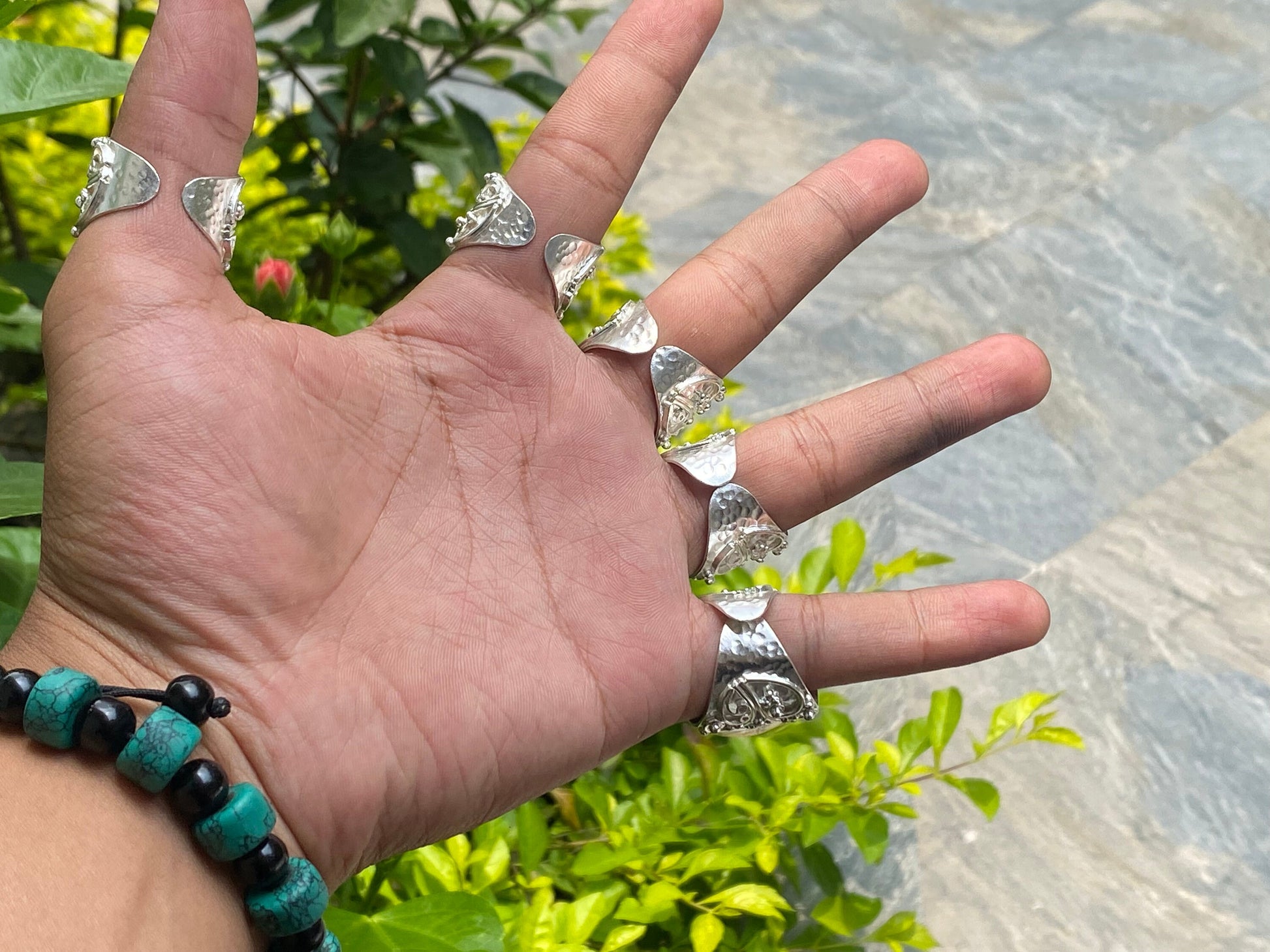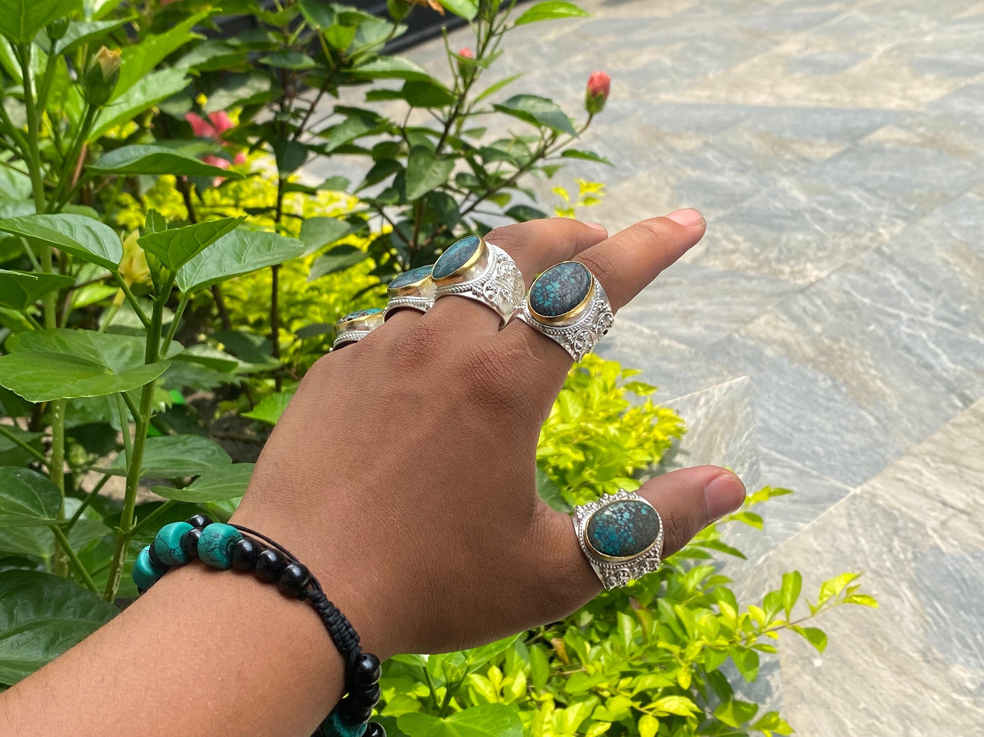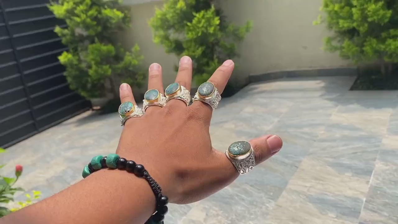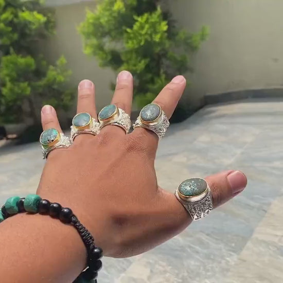 With this handcrafted ring from Nepal, discover the essence of bohemian chic. Its durable brass construction with a brushed gold and silver overlay and hammered texture displays originality. This flexible two-toned ring combines beauty with spiritual importance, adorned with real turquoise, which is known for its healing abilities. It's the ideal unisex present for thoughtful personal expression and everyday wear.