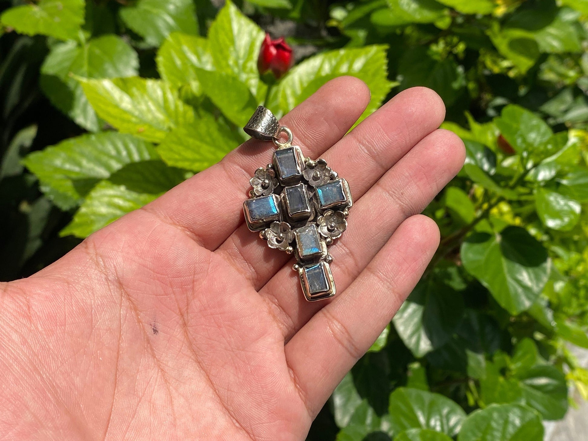 Aesthetic Daily wear Cross Shaped Pendant, Tibetan Silver adorned with Natural Labradorite, Handmade pendant, Unisex Pendant, Unique design.