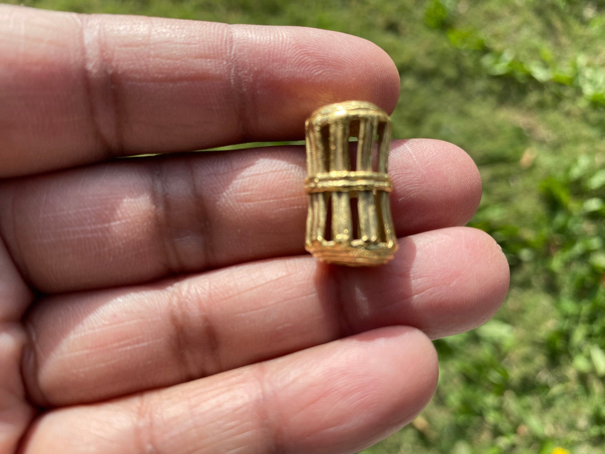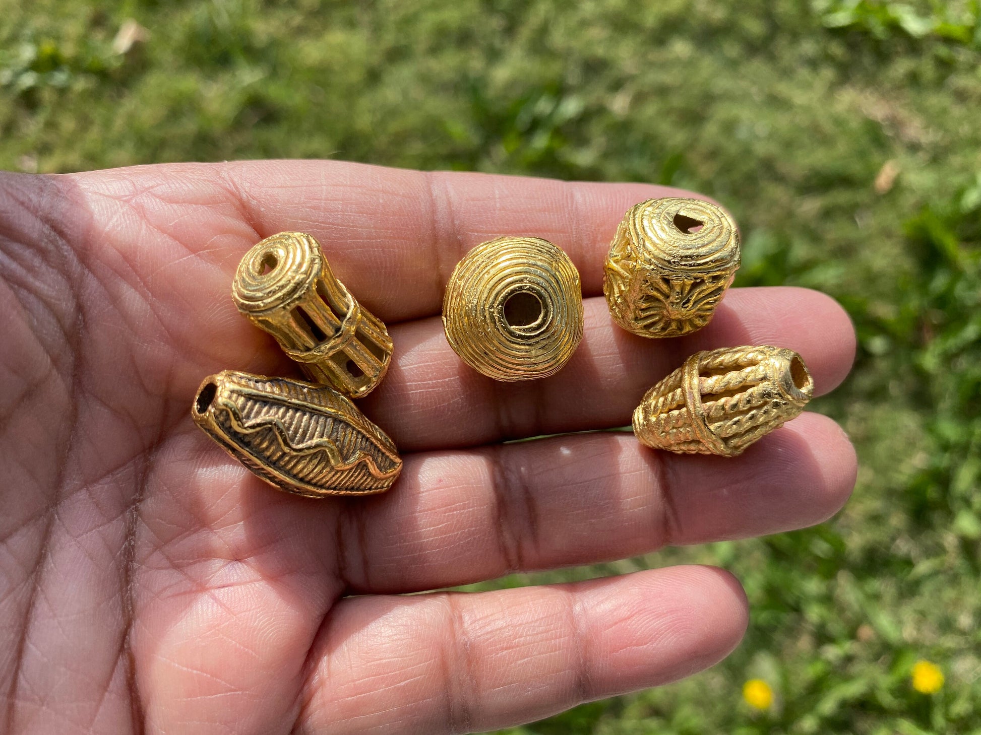 These beautiful high quality 18K Brushed Gold Overlay over brass with anti-tarnish finish so that It will be durable. These are unique African brass beads. They stem from Ghana. This size and design is special, and the engraved braided pattern on the oval bead is unique. They are produced through the lost-wax casting method, a largely popular bead making method in West Africa.Please note: you will receive a random bead