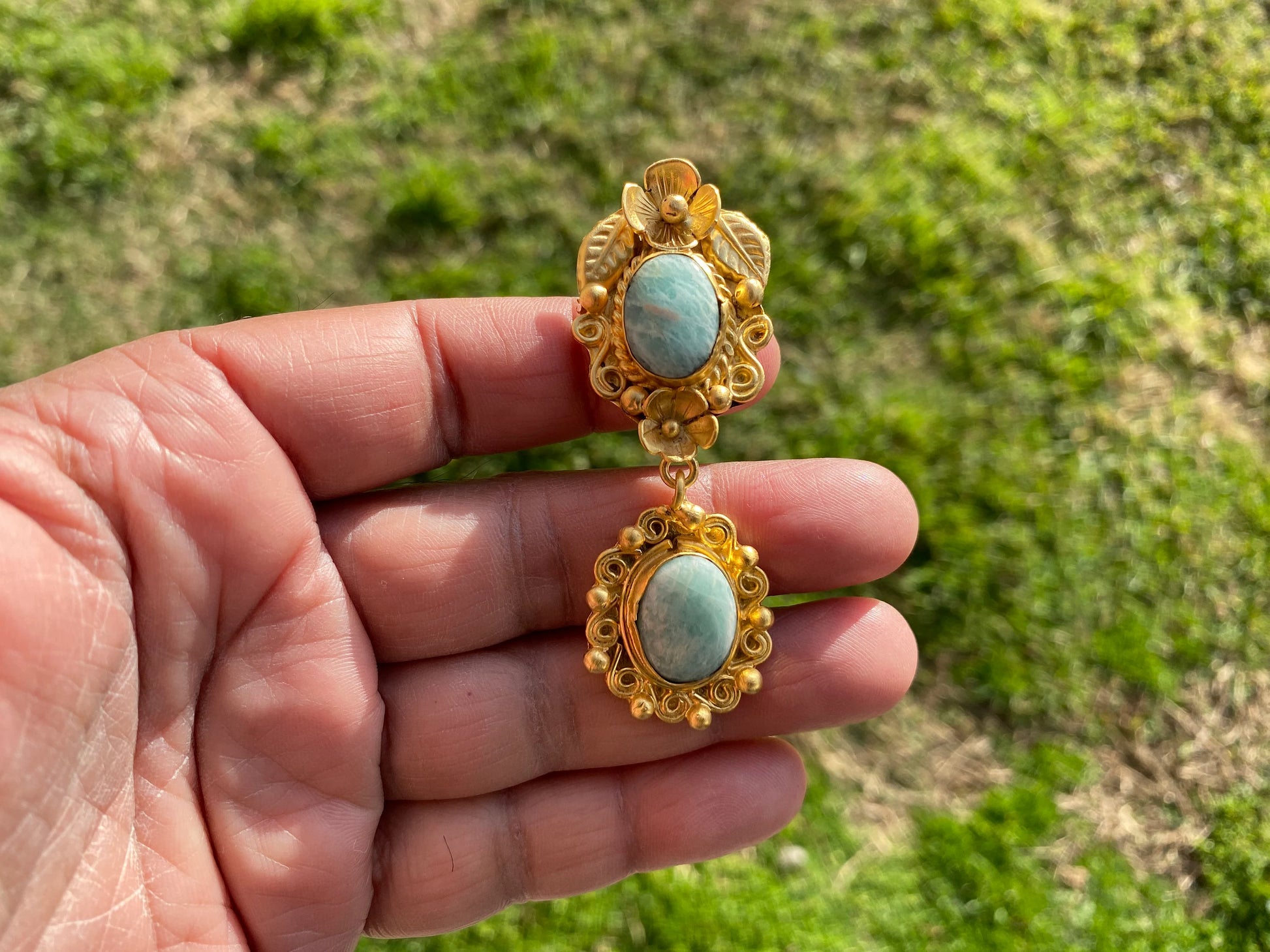 This one of a kind Tibetan Pendant made with Non Tarnish 18K Brushed Gold Overlay over Brass with Amazonite Natural Stone. Beautiful hand carved design on the back of the pendant. These are sure to make an impact on your jewelry project. This pendant would be a great addition to your necklace, would look great strung on beaded Necklace, Chain or Mala. This Ethnic designs pendant is handmade in Nepal. Perfectly bohemian in style, these tribal beauties come from the Himalayas.Beauty and magic of this pendant that is unmatched as they are handmade and are one of a kind. With the nature of them being handmade, each product is unique in its own right and no two products are the exact same.
