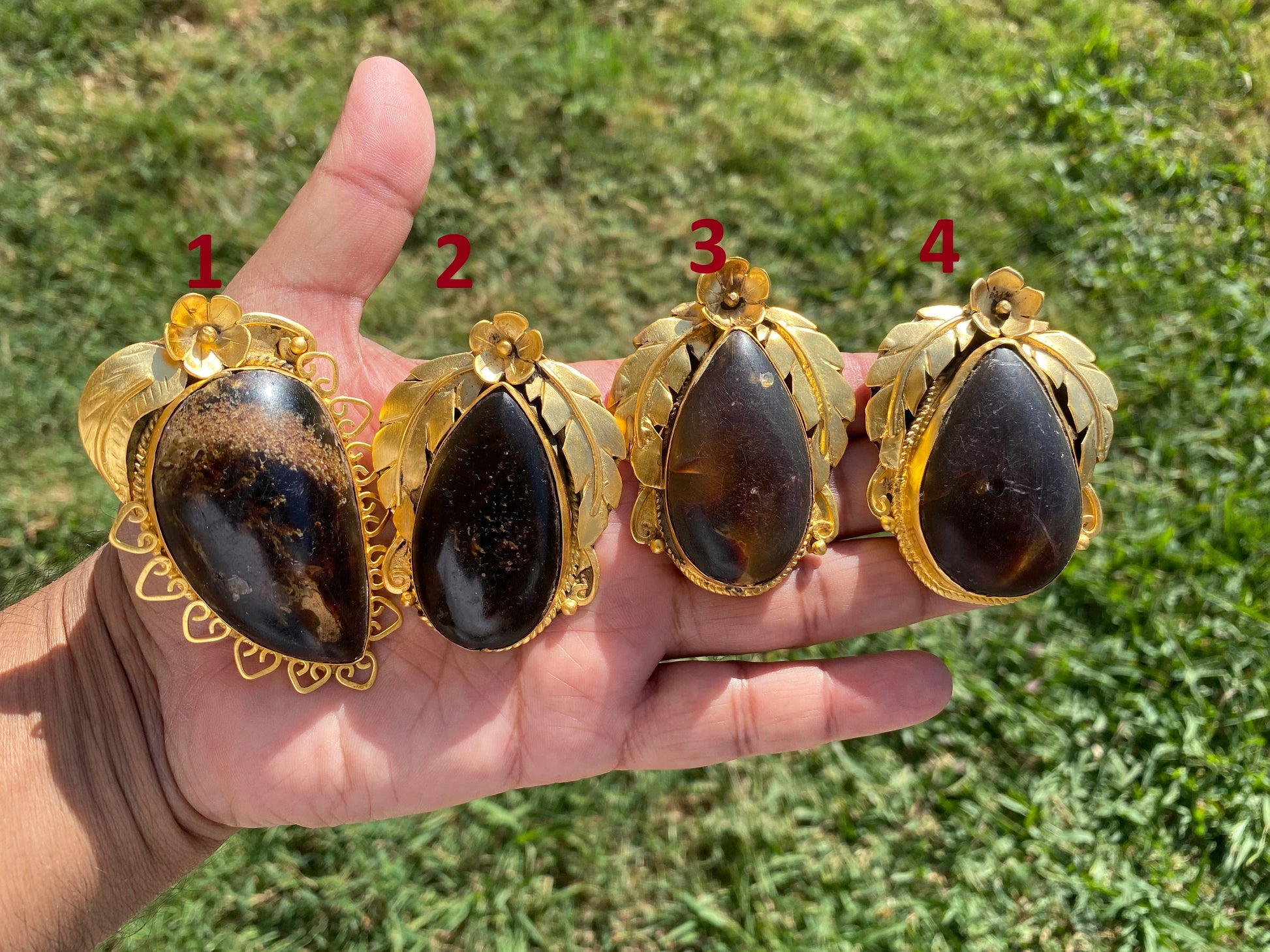 The amber, with its golden-yellow to deep-orange glow, seems to trap within it echoes of a time long gone—sometimes even preserving minute remnants of prehistoric flora or fauna. This ethereal glow of the past is amplified by the luxurious embrace of the gold overlay, crafted with precision to showcase the amber's organic beauty while adding a touch of modern sophistication.