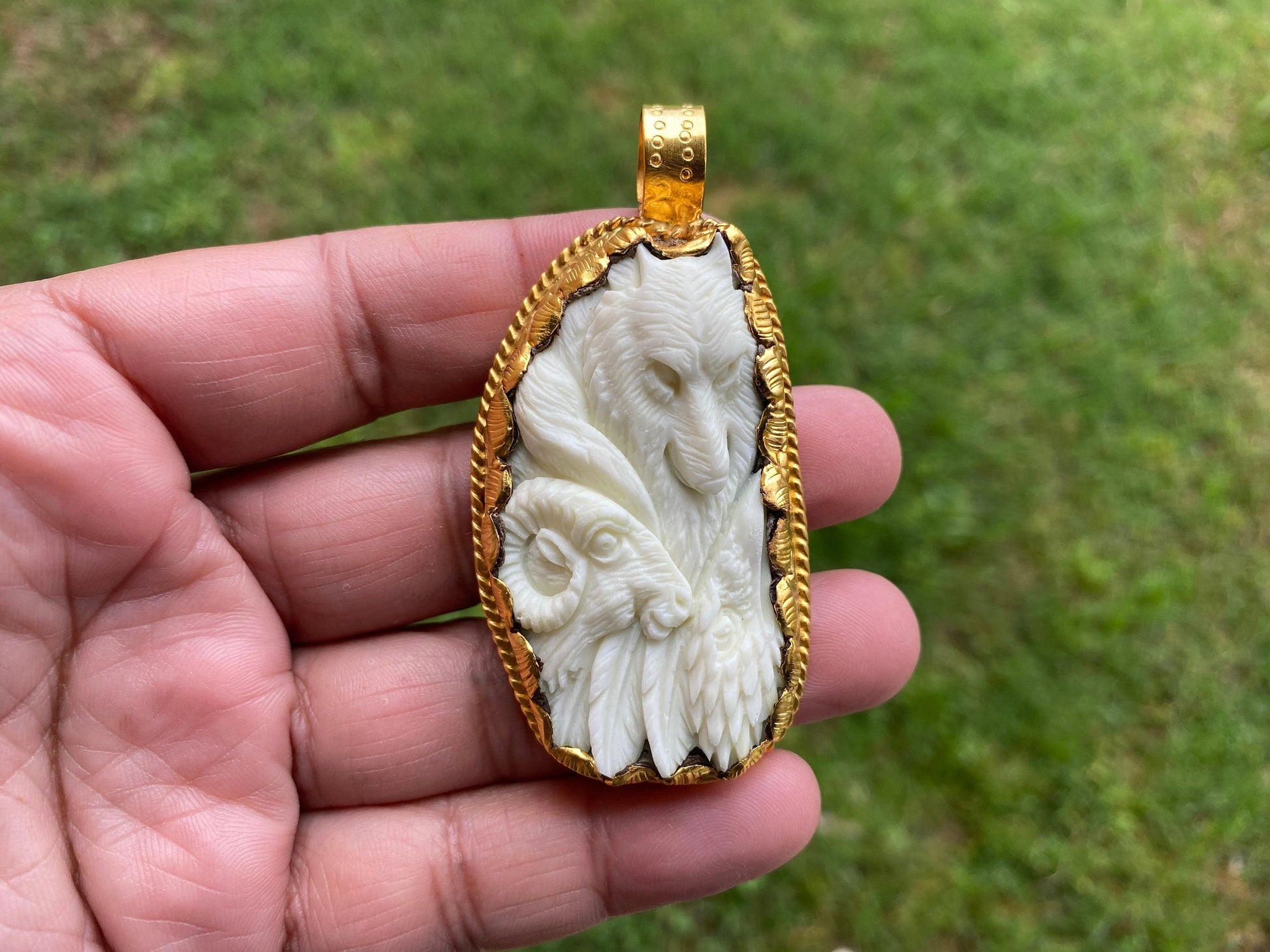 This Gorgeous hand carved buffalo bone pendant made with high quality 18k Matte Gold overlay over brass with Anti tarnish finish with a remarkable detail of carving. Hand-carved design on the back side of Pendant. This Tibetan designs pendant is handmade in Nepal and adorned by a beautiful pendant. Perfectly bohemian in style, these tribal beauties come from the Himalayas. Beauty of this pendant that is unmatched as they are handmade and are one of a kind. With the nature of them being handmade, each product is unique in its own right and no two products are the exact same.