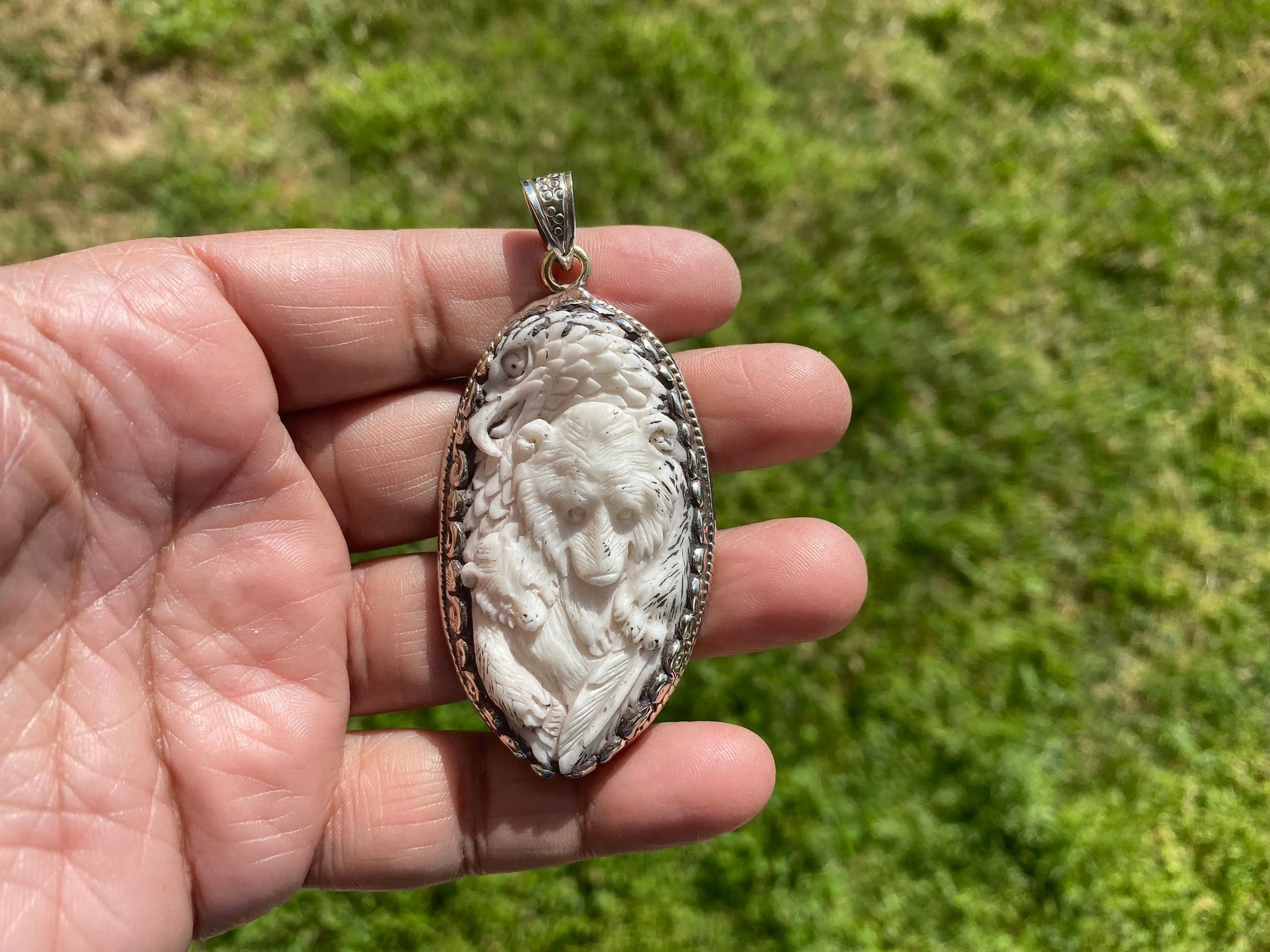 Bear with Eagle Buffalo Bone Hand Carved Tibetan Silver Pendant, Repousse Silver Pendant, Jewelry for Men or Women, Animal Lover Pendant