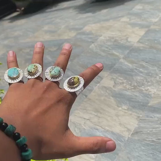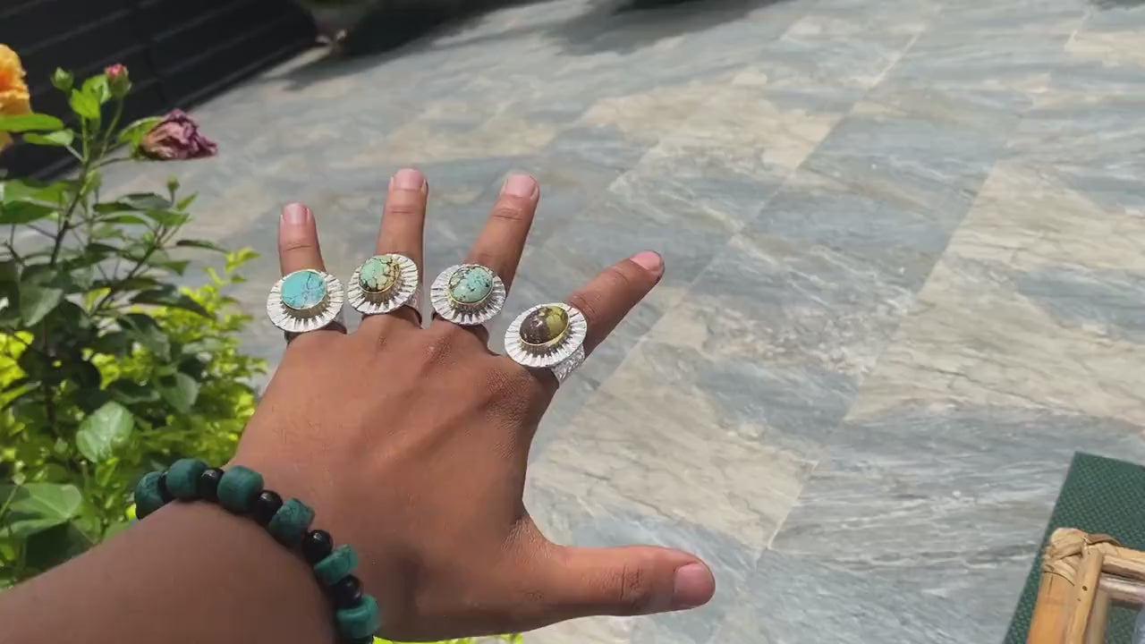 This beautiful handmade ring features a gold and silver overlay on brass, showcasing a natural gemstone pendant. Its adjustable design ensures a perfect fit for both men and women, embodying Boho fashion with a touch of elegance. Crafted in Nepal, this unisex ring combines traditional artistry with modern style, making it a unique and versatile accessory.