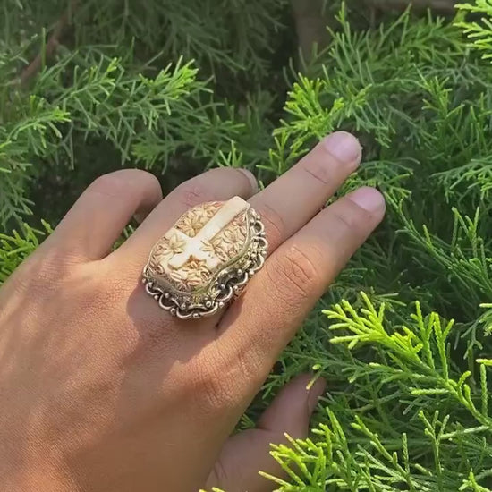 Big Adjustable Bone Carved Tibetan Silver Ring, Cross Ring, Floral design on Cross.