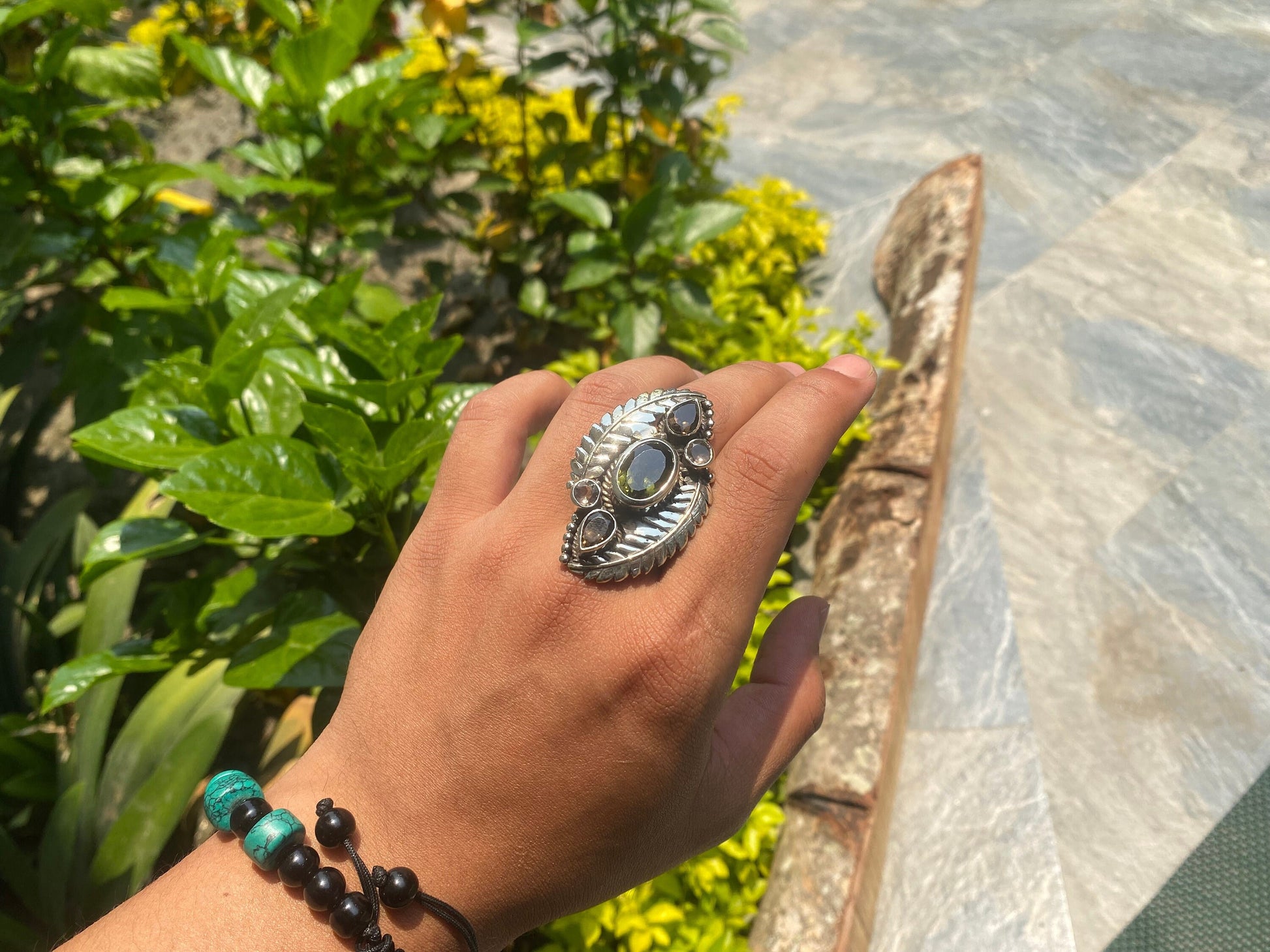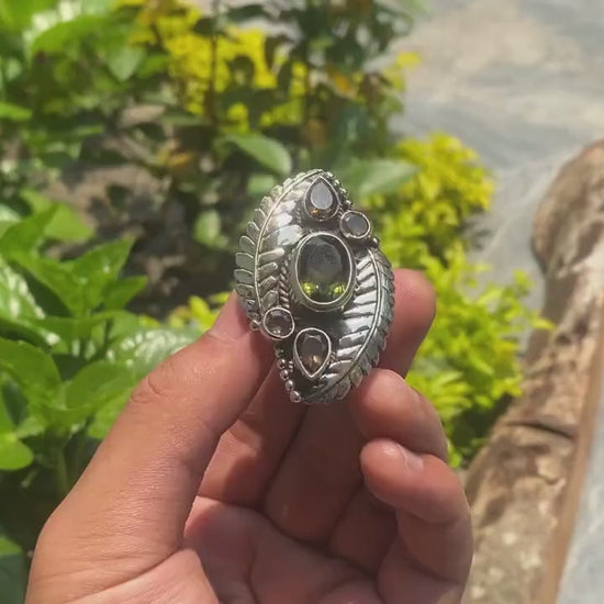 With this gorgeous handmade ring made of Tibetan silver and decorated with captivating white topaz, smokey quartz, and peridotite jewels, you can embrace boho style. Any wearer may find the ideal fit thanks to its adjustable construction, and the hammered texture lends a touch of rustic charm. This ring is a must-have accessory for anyone who enjoys hippie design. It stands out in any collection since it so skillfully blends elegance and earthy emotions.