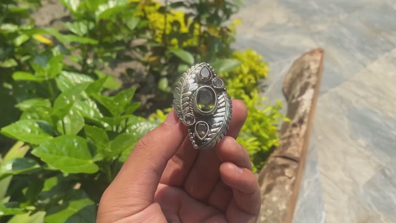 Big Adjustable Handmade Ring, Tibetan Silver Ring adorned with White Topaz, Smoky Quartz and Peridotite.