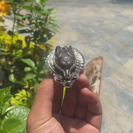 Big Adjustable Wolf Head Ring, Tibetan Silver Ring adorned with Labradorite, Aesthetic Ring.