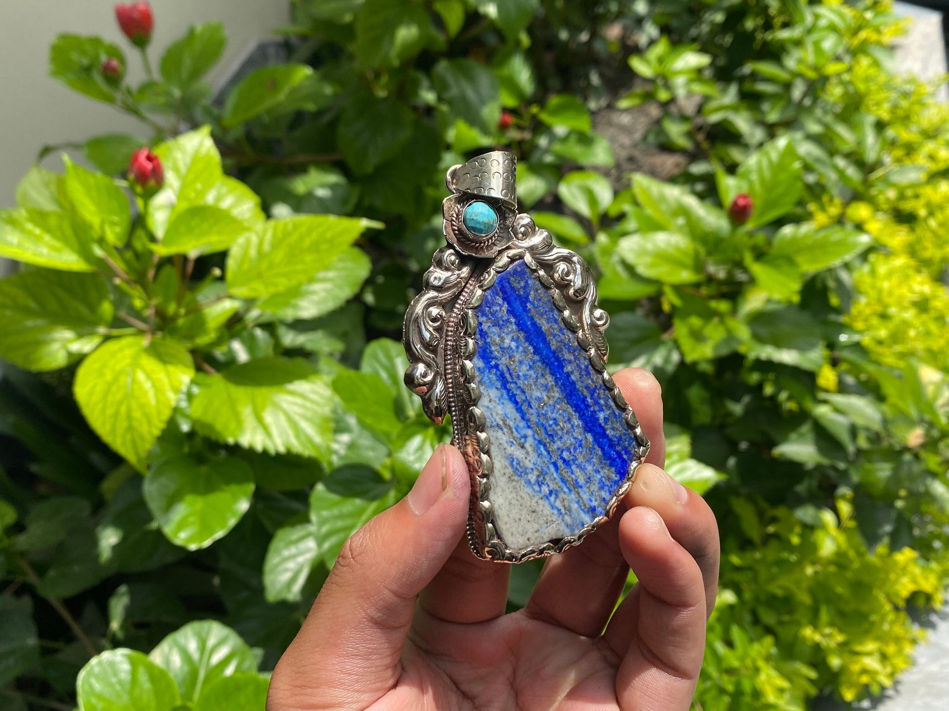 Big Natural Raw Lapis Pendant adorned with Tibetan Silver, Turquoise Pendant, Floral designed Pendant, Gift ideas, DailyWearHealingPendant.