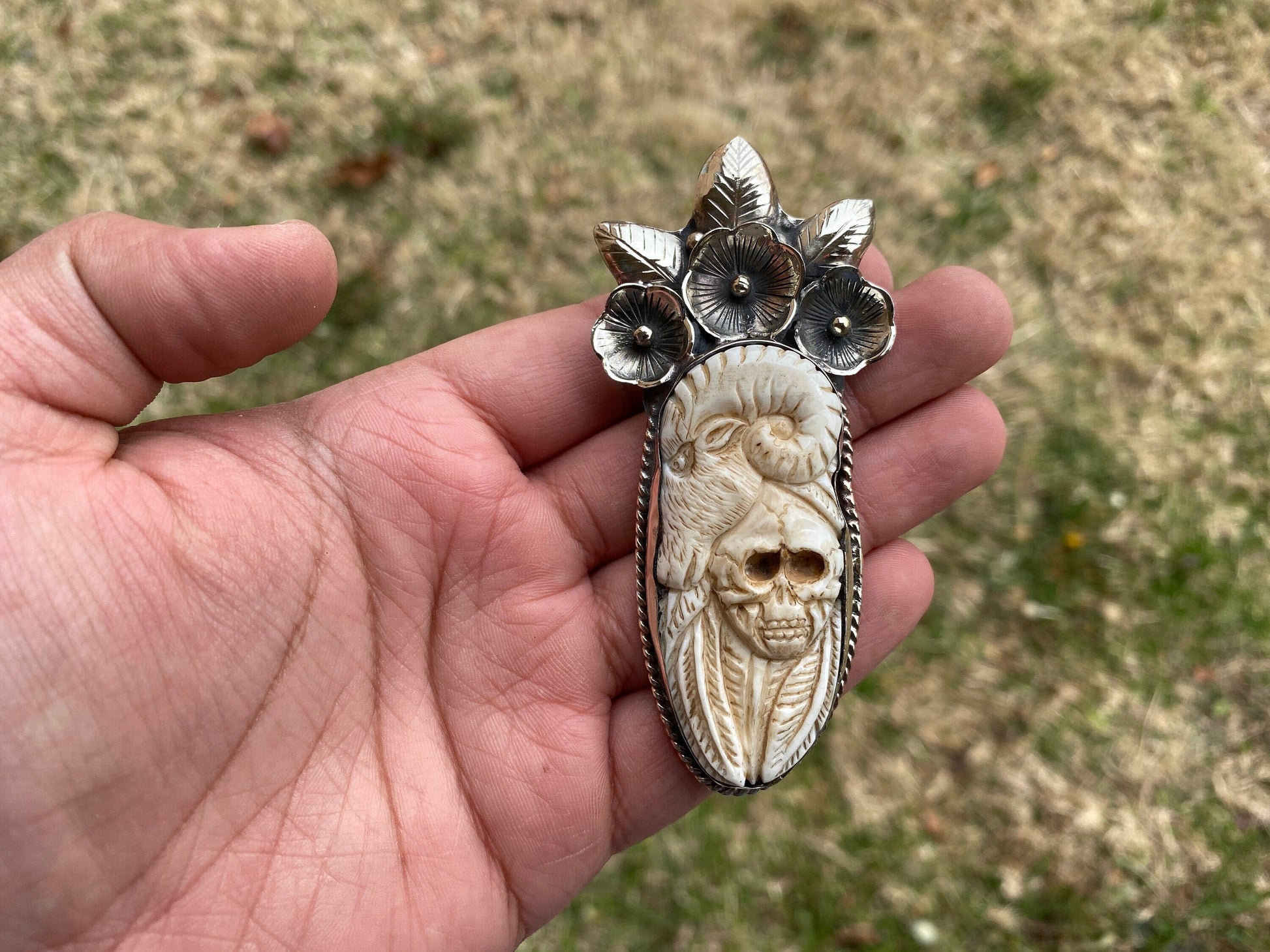 Water Buffalo Bone Pendant, Hand Carved Sheep & Skull, Made with Tibetan Silver, Himalayan, Tribal, Ethnic, Flower Designs,