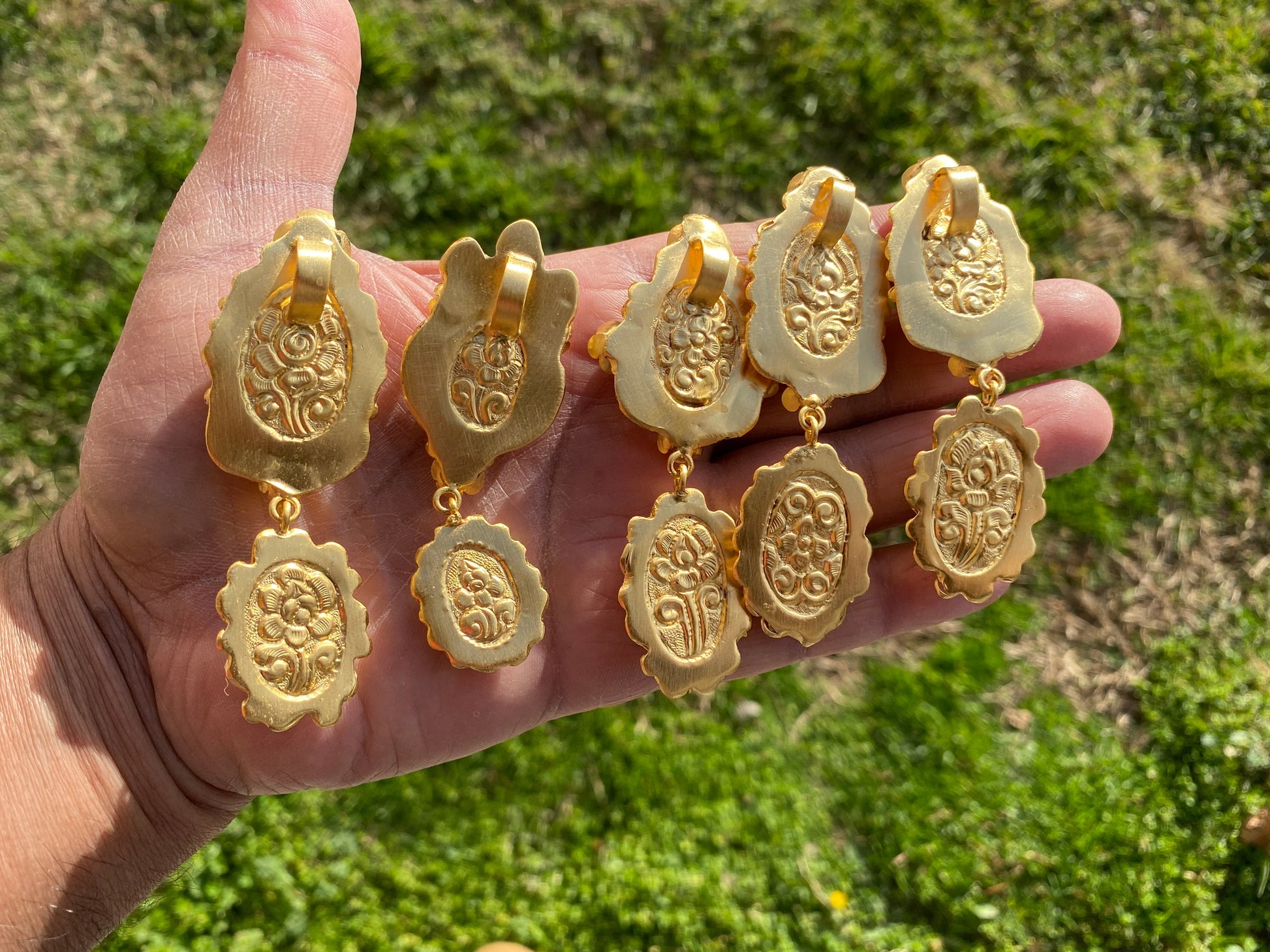 This listing is for 1 piece.At wholesale price!!! This one of a kind Tibetan Pendant made with Non Tarnish 18K Brushed Gold Overlay over Brass & Larimar Natural Stone. Beautiful hand carved design on the back of the pendant. These are sure to make an...