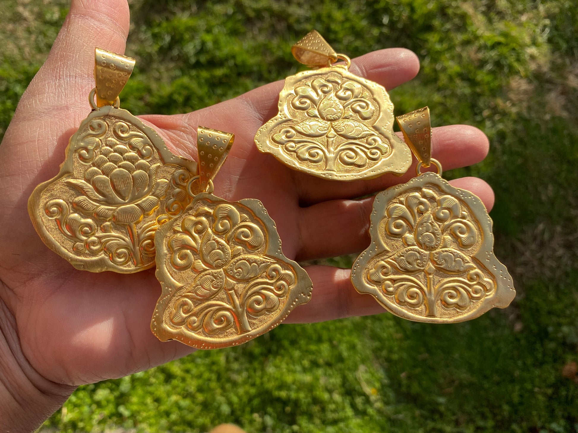Jewelry from Nepal hand-carved Pendant made with Shell with Black Onyx Gemstone settings with 18K Brushed Gold Overlay over Brass Non Tarnish. These pendants are sure to make an impact on your jewelry project. These Products would be a great addition to your necklace project. This Pendant would look great strung on beaded necklace .chain or Malas.The pendant has a beautiful carving design in the back and the large hanging hole of 10 mm allows you to add thicker threads and leather. The pendant is very lightweight .These Ethnic pendants have a beauty and magic to them that is unmatched as they are handmade in Kathmandu, Nepal and are one of a kind. With the nature of them being handmade, each product is unique in its own right and no two products are the same.