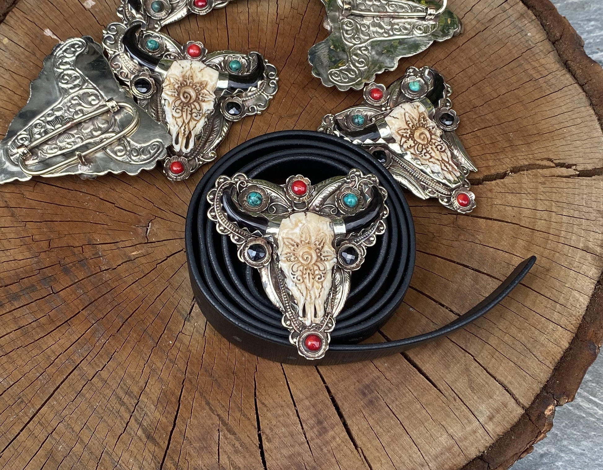 Bulls head shaped Tibetan Silver Belt Buckle adorned with Natural Turquoise, Red Coral, Black Onyx. Floral Design carved on buffalo bone.