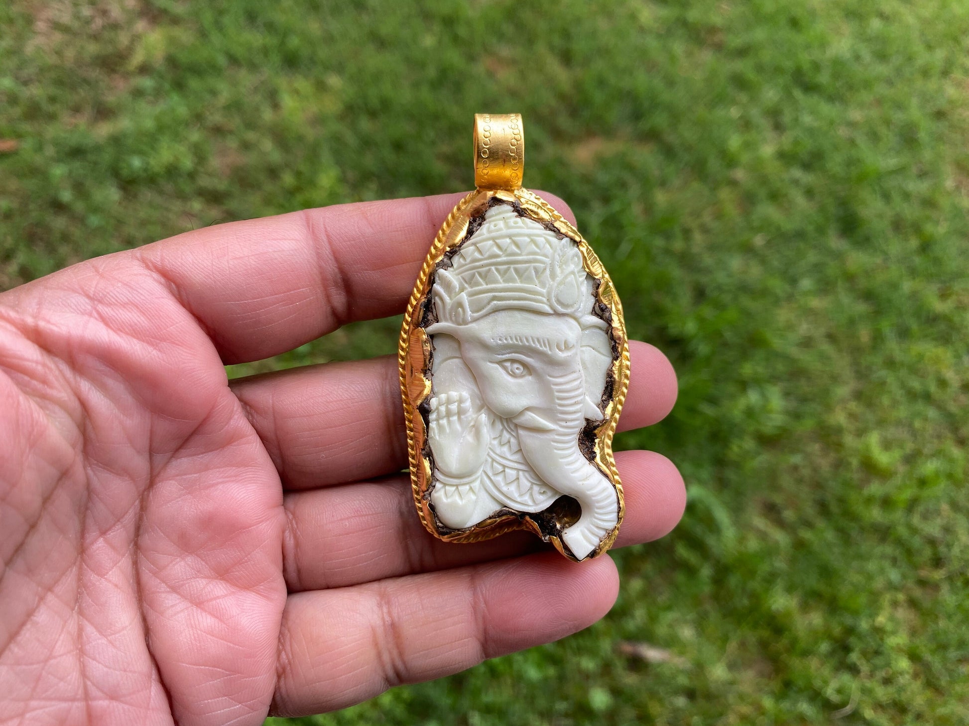 Carved Bone Ganesh High Quality 18K Brushed Gold Overlay Non Tarnish Tibetan Pendant, Yoga Pendant, Spiritual Pendant for Men or Women, Boho