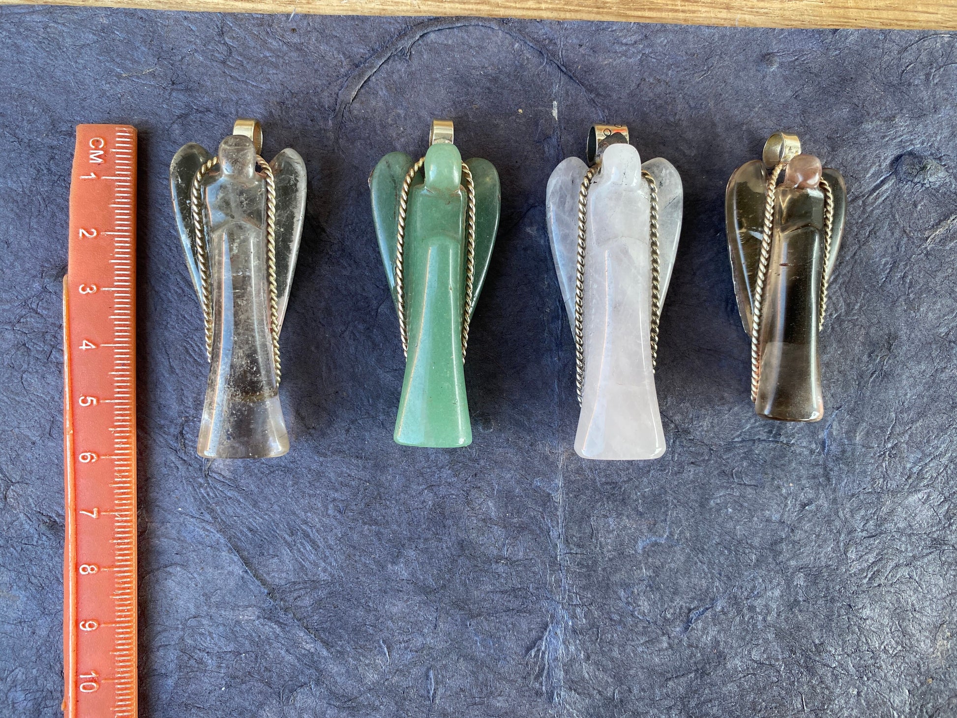 Carved Crystal Angel Tibetan Silver Pendant, Green Aventurine Angel, Rose Quartz Angel Jewelry, Smoky Quartz Angel Pendant for Necklace