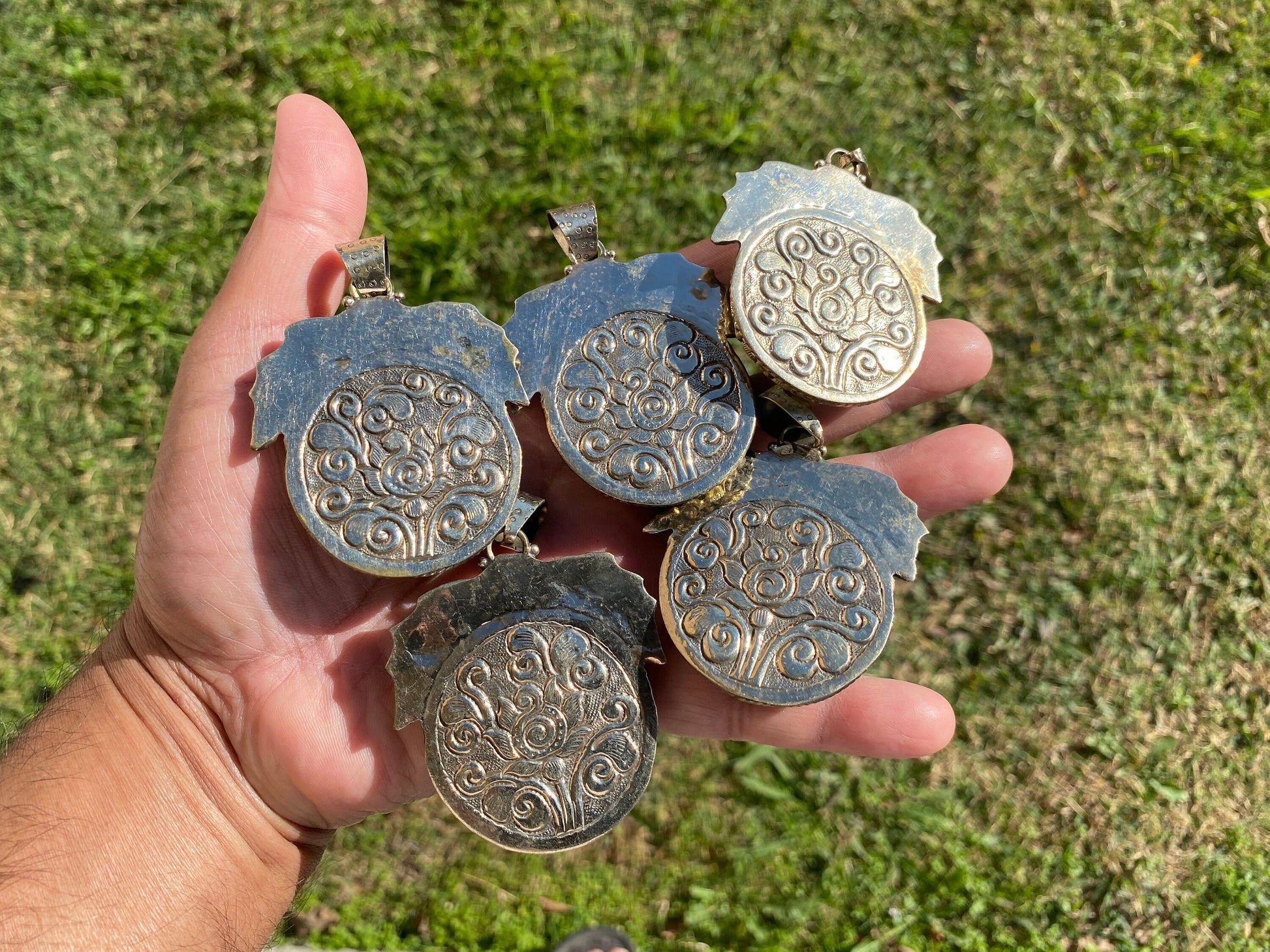 Measurement: approximately Length 75 mm (measuring from bail to bottom), width 53 mm from the widest side, bail size: 10 mm and weighs about 39.70 gm.Da: 0460Disclaimer: Items are handmade so please note: Each item is unique may have some small imperfections. There can be a slight difference in actual color than shown in picture.Images may appear enlarged or smaller. Please refer to the measurements given. ✤ Keep in mind:1. Product VarianceAs the jewelry is handmade in nature, the items may experience variance in texture, shape, color, and finish. This also comes with some imperfections, which sets them apart from jewelry made in a factory – that being said please read the description thoroughly and view the pictures before you make your final purchase. As always, please don’t hesitate to ask us if you have any questions as we are more than happy to provide you with utmost quality assurance.