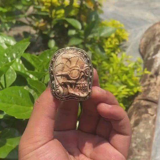 Cool looking Skull carved on Buffalo Bone, Big Adjustable Tibetan Silver Ring, Cool Gift Ideas.
