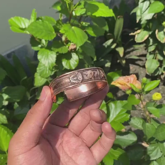 This hammered copper bracelet, engraved with a Tibetan healing mantra, is handmade in Nepal. Perfect for daily wear and gifting, it combines traditional craftsmanship with spiritual significance. The bracelet's healing properties promote well-being and balance, making it an ideal accessory for both men and women seeking harmony and a touch of elegance in their daily lives.