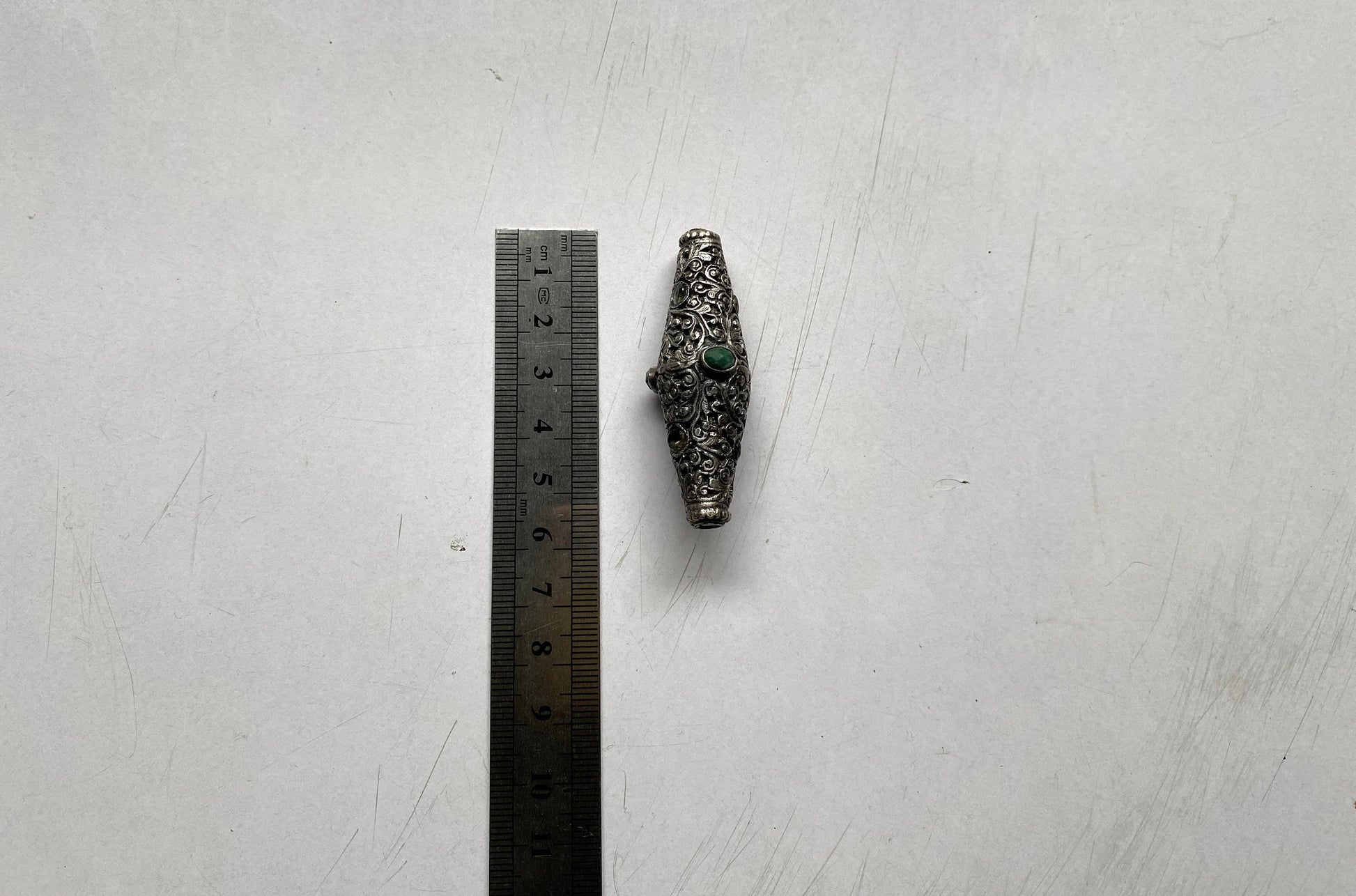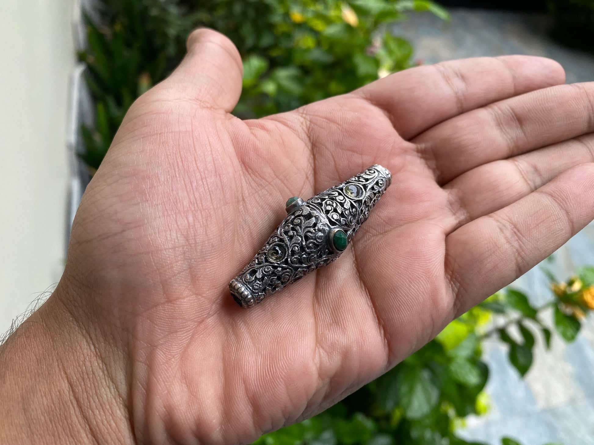 Handcrafted in Nepal, these Tibetan copper beads feature inlaid emerald and peridot. Perfect for necklaces, bracelets, or chains, they add a unique, artisan touch to any jewelry project.