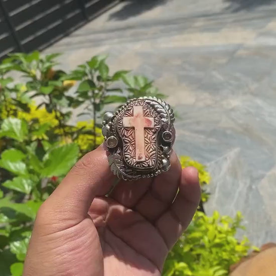 Discover divine elegance with our Adjustable Tibetan Silver Ring, featuring a Cross Carved on Buffalo Bone adorned with floral details. Handmade with care, its hammered silver band adds rustic charm while the smoky quartz accent exudes sophistication. This timeless piece makes a meaningful gift, blending intricate craftsmanship with spiritual symbolism for a truly memorable accessory.