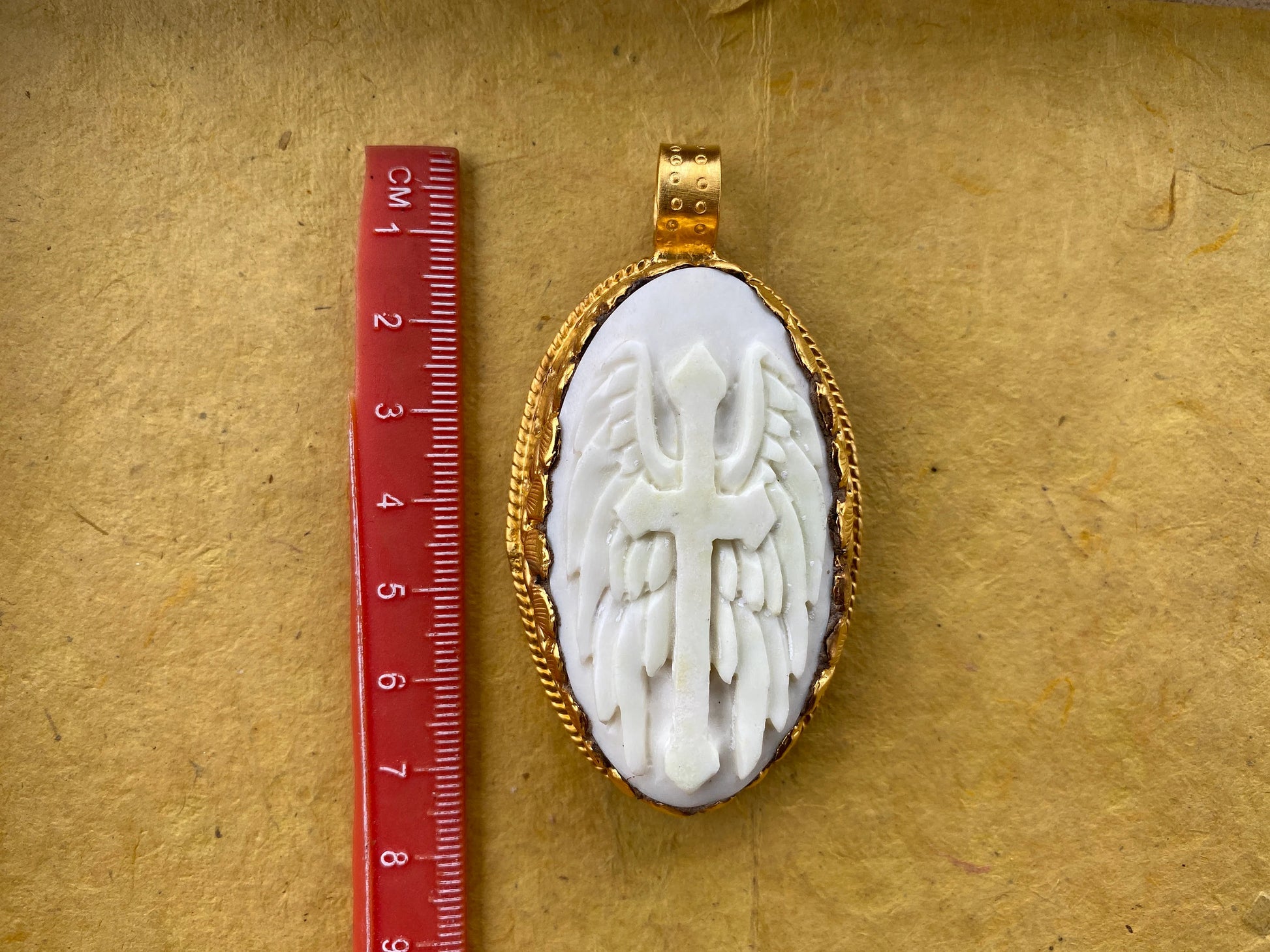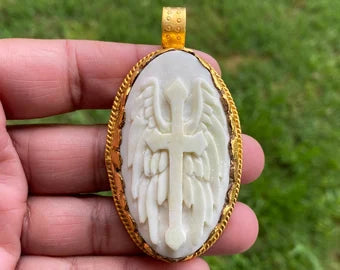 Cross with Angel Wings Bone Carved Pendant, High Quality 18K Matte Gold Overlay Non Tarnish, Guardian Angel Cross, Unisex, Religious Jewelry