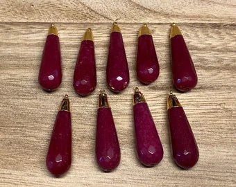 This listing is for 1 piece.At wholesale price!!!Measurement: approximately Length 27 mm ( measuring from bail to bottom ), width 10 mm from the widest side, bail size: 2 mm and weighs about 3.3 gm.These beautiful high quality 18K Gold Electroplated with anti-tarnish finish so that It will not change the color. Made with natural dyed faceted Ruby gemstone. These Beads are sure to make an impact on your jewelry project. These beads would be a great addition to your necklace, bracelet or earring project. These beads would look great strung on beaded necklace or Chain necklace.Please note: you will receive a random bead.Disclaimer: Items are handmade so please note: Each item is unique may have some small imperfections. There can be a slight difference in actual color than shown in picture.Images may appear enlarged or smaller. Please refer to the measurements given. ✤ Keep in mind:1. Product VarianceAs the jewelry is handmade in nature, the items may experience variance in texture, shape, color, and finish. This also comes with some imperfections, which sets them apart from jewelry made in a factory – that being said please read the description thoroughly and view the pictures before you make your final purchase. As always, please don’t hesitate to ask us if you have any questions as we are more than happy to provide you with utmost quality assurance. 2. Photography & ColorsDue to the fact that we photograph each of our items, some items may seem larger than the actual size and the colors may seem off as well, please make sure to read the dimensions in order to avoid problems that can be easily taken care of. We do our best to photograph the items with as much detail as possible, however, images can deceive the eye, again – feel free to reach us with any questions or concerns!3. LiabilityDiscover Designs Inc. shall not be held responsible for any injuries, damages, or losses resulting from the use of products purchased from our shop. Therefore, by purchasing from our Etsy Store, you the costumer agree that all purchases and uses of products are responsibilities of the buyer. With that said, Discover Designs will not be held responsible for the use, misuse, or mishandling of any items and buyers assume all liabilities for the products they have purchased. The purchase of an item from Discover Designs demonstrates acceptance of this disclosure and releases Discover Designs and its affiliates from liabilities arising thereof. ✪Not a toy, not intended for use by, or in products intended for children 14 or under. May be harmful if swallowed.Thanks for stopping by!