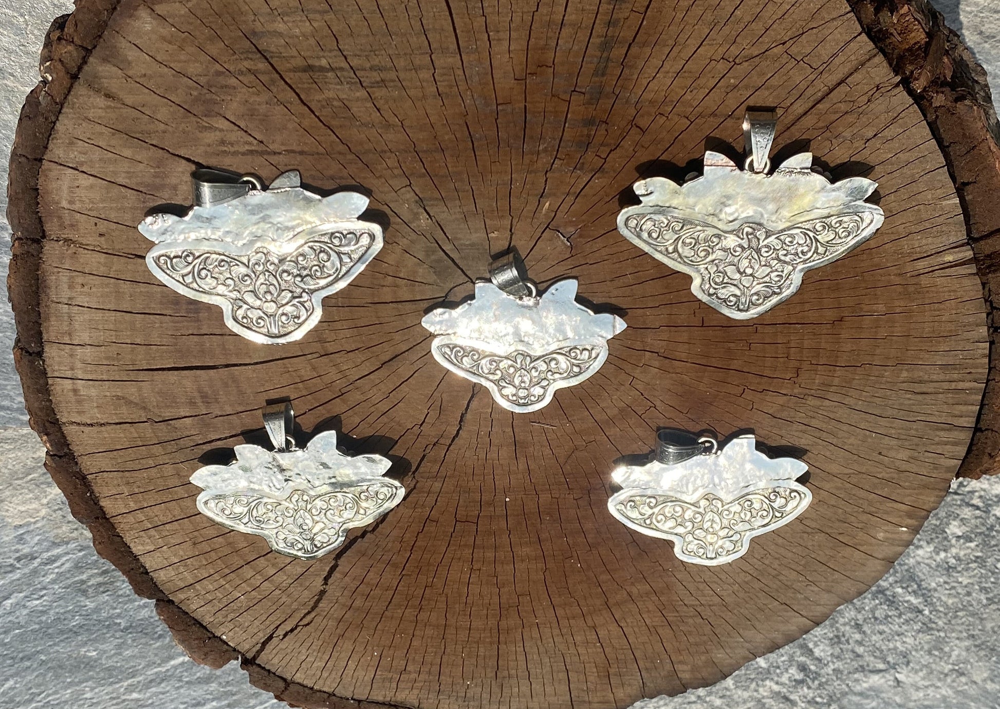 This eagle-shaped pendant is crafted from natural labradorite, perfect for daily wear. It features a unique floral design set in Tibetan silver, showcasing intricate handmade details. The hammered finish enhances its rustic charm. This healing pendant makes an excellent gift for him or her, combining elegance with the mystical properties of labradorite. Ideal for those who appreciate distinctive, artisanal jewelry.