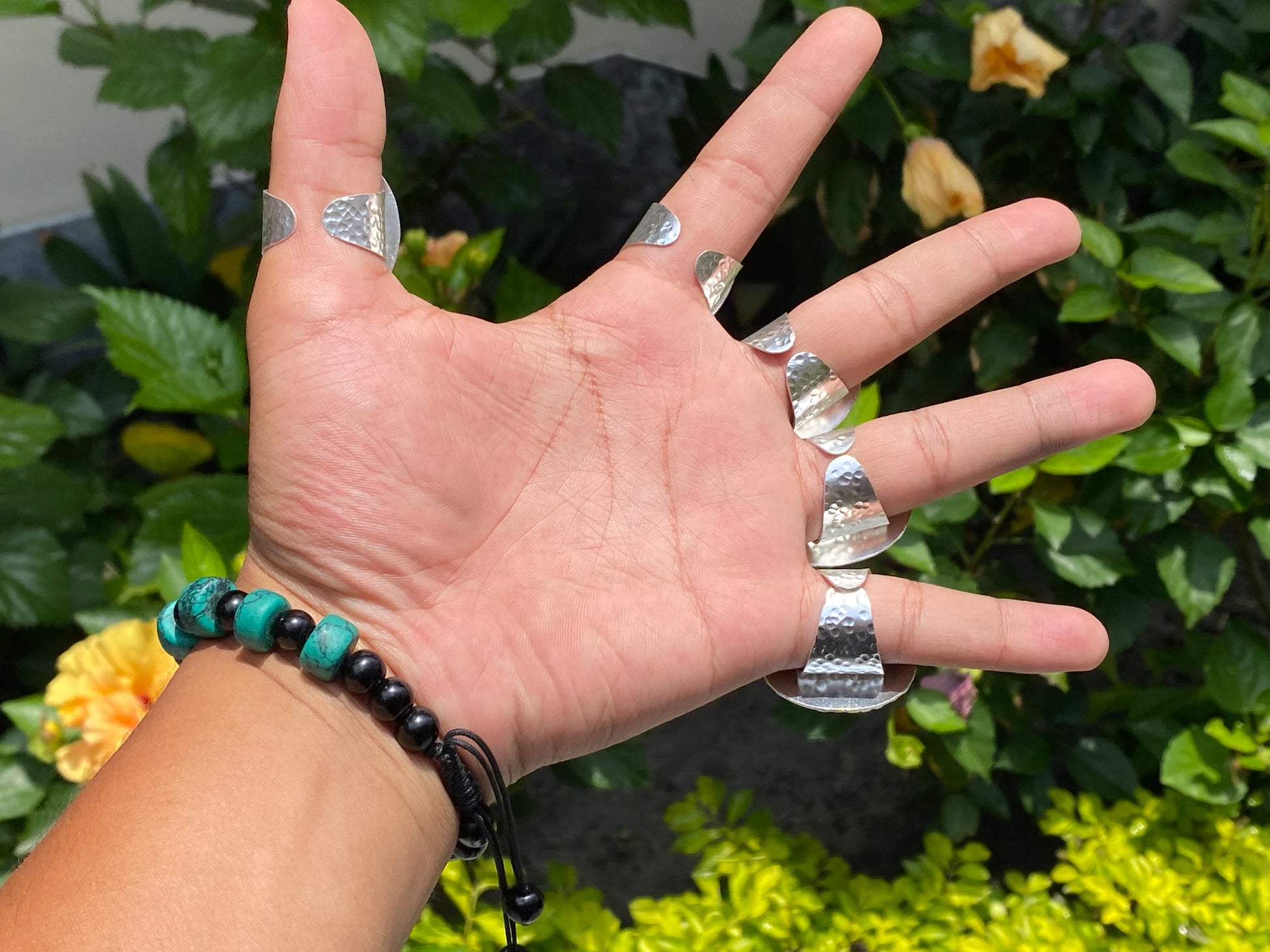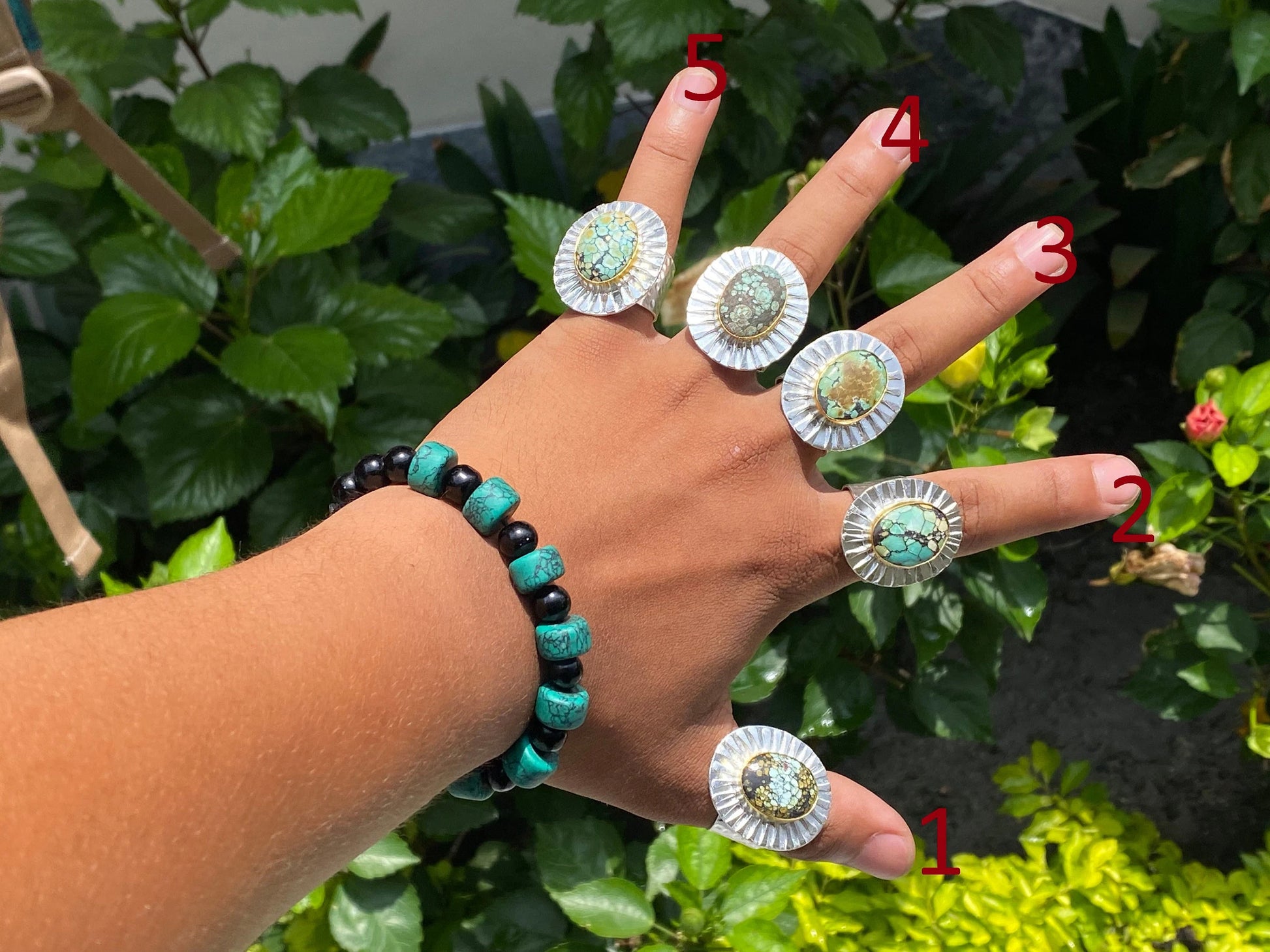 This elegant adjustable two-tone ring features a stunning hammered design, perfect for daily wear. Adorned with a healing turquoise stone, it combines beauty and wellness. Crafted with a gold and silver overlay on brass, this handmade ring offers a unique blend of luxury and durability....