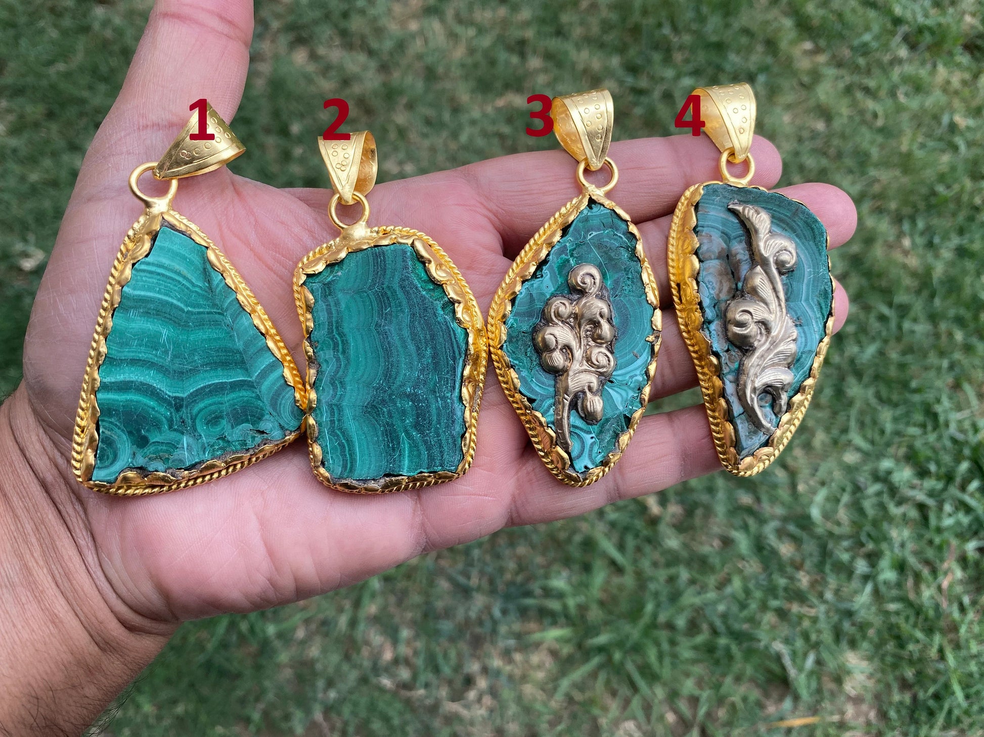 This listing is for 1 piece.At wholesale price!!!Measurement: # 1 - Pendant: approximately Length 75 mm (measuring from bail to bottom), width 43 mm from the widest side, bail size: 12 mm and weight about 39.80 gm.# 2 - Pendant: approximately Length 80 mm (measuring from bail to bottom), width 35 mm from the widest side, bail size: 12 mm and weight about 49.20 gm.# 3 - Pendant: approximately Length 85 mm (measuring from bail to bottom), width 35 mm from the widest side, bail size: 12 mm and weight about 39.10 gm.# 4 - Pendant: approximately Length 90 mm (measuring from bail to bottom), width 35 mm from the widest side, bail size: 12 mm and weight about 47.00 gm.Disclaimer: Items are handmade so please note: Each item is unique may have some small imperfections. There can be a slight difference in actual color than shown in picture.Images may appear enlarged or smaller. Please refer to the measurements given. "Experience the deep allure of nature with our Malachite Pendant. Revered for its lush, verdant hues and intricate banded patterns, malachite tells a tale as ancient as time. Each swirl and layer on this pendant is a testament to the countless epochs and forces of nature that shaped it. A symbol of transformation and protection, malachite is not only mesmerizing in its beauty but also renowned for its healing properties. Handcrafted to perfection, this pendant elegantly showcases the gemstone's organic opulence. Wearing it is a dance with nature, a celebration of the rich tapestry of life embedded within its emerald depths. Whether you're drawn to its aesthetic charm or its metaphysical resonance, this pendant is a timeless piece that speaks to the soul."✤ Keep in mind:1. Product VarianceAs the jewelry is handmade in nature, the items may experience variance in texture, shape, color, and finish. This also comes with some imperfections, which sets them apart from jewelry made in a factory – that being said please read the description thoroughly and view the pictures before you make your final purchase. As always, please don’t hesitate to ask us if you have any questions as we are more than happy to provide you with utmost quality assurance.