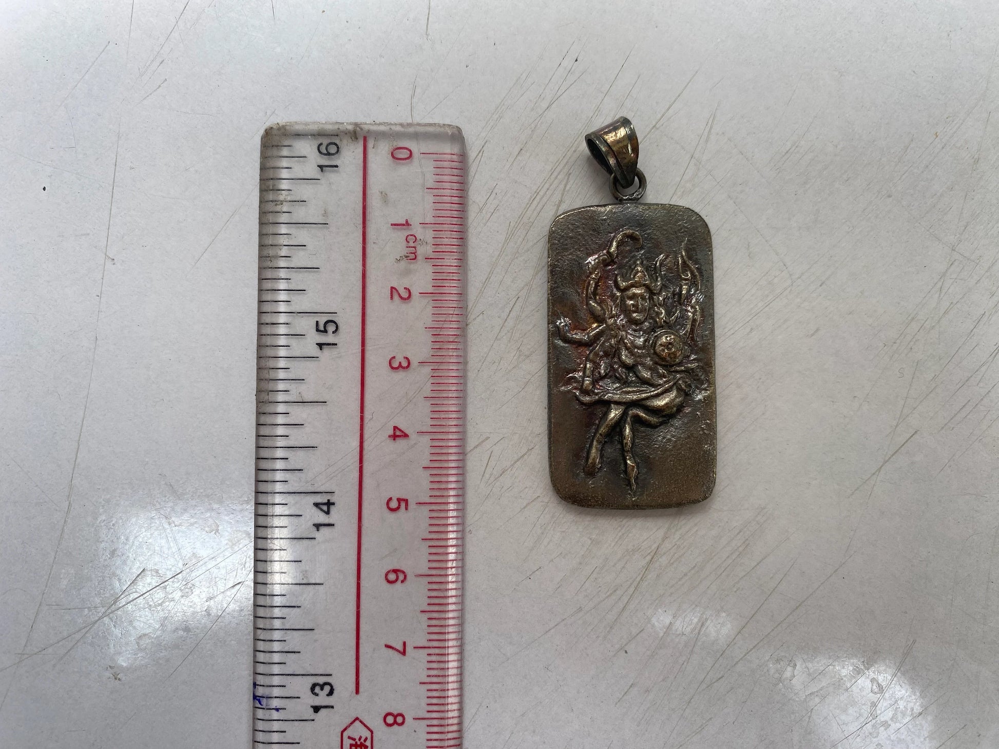 Kali/Mahakali, a major goddess of Hindu epics and mythology is the goddess of divine feminine energy and eternal chaos of the universe. She is the embodiment of unaltered chaos itself. Use this powerful pendant to fill yourself with mystical strength and spirituality. The pendant is made up of brass which is then finely overlaid by silver giving it a glistening glow and silvery shine. C 2855This listing is for 1 piece.Measurement: approximately Length 50 mm (measuring from bail to bottom), width 20 mm from widest side, bail size: 9 mm and weighs about 18.00gm.